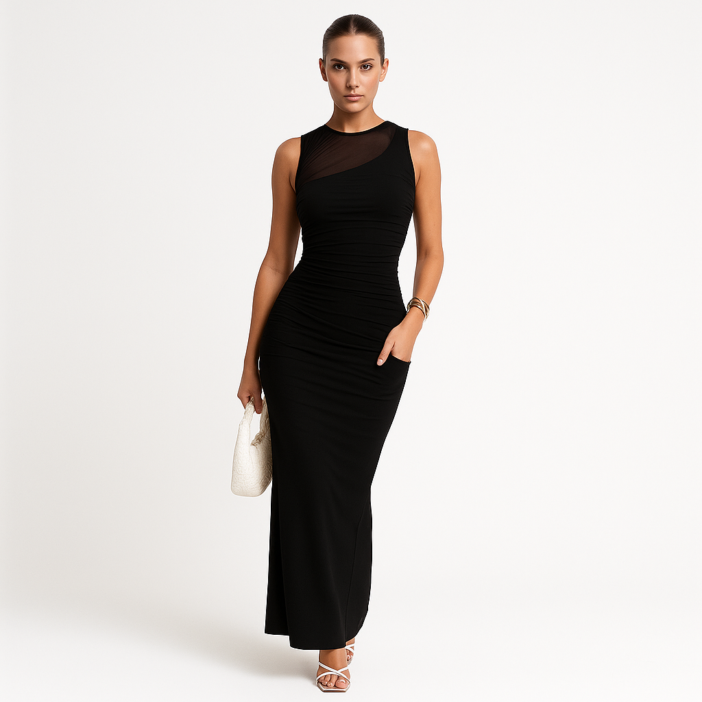 Denne lange kjole kombinerer en moderne, figursyet silhuet med elegante detaljer som mesh-udskæring og asymmetrisk hals. Det bløde, elastiske materiale giver både komfort og stil – ideel til alt fra ferie til aftenarrangementer.