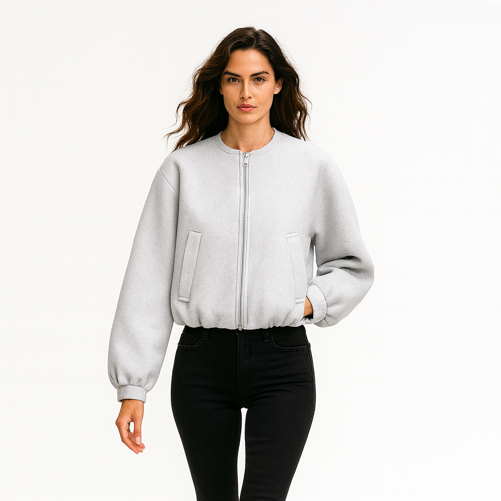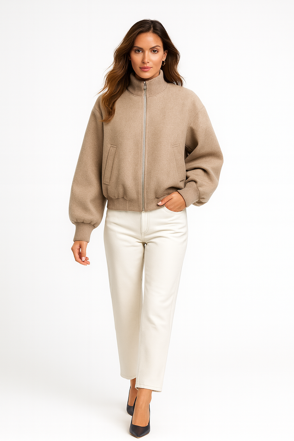 Denne moderne bomberjakke giver et elegant twist til en klassisk silhuet. Det minimalistiske design og de let puffede ærmer skaber et sofistikeret udtryk – perfekt til både hverdagsbrug og smart casual outfits.