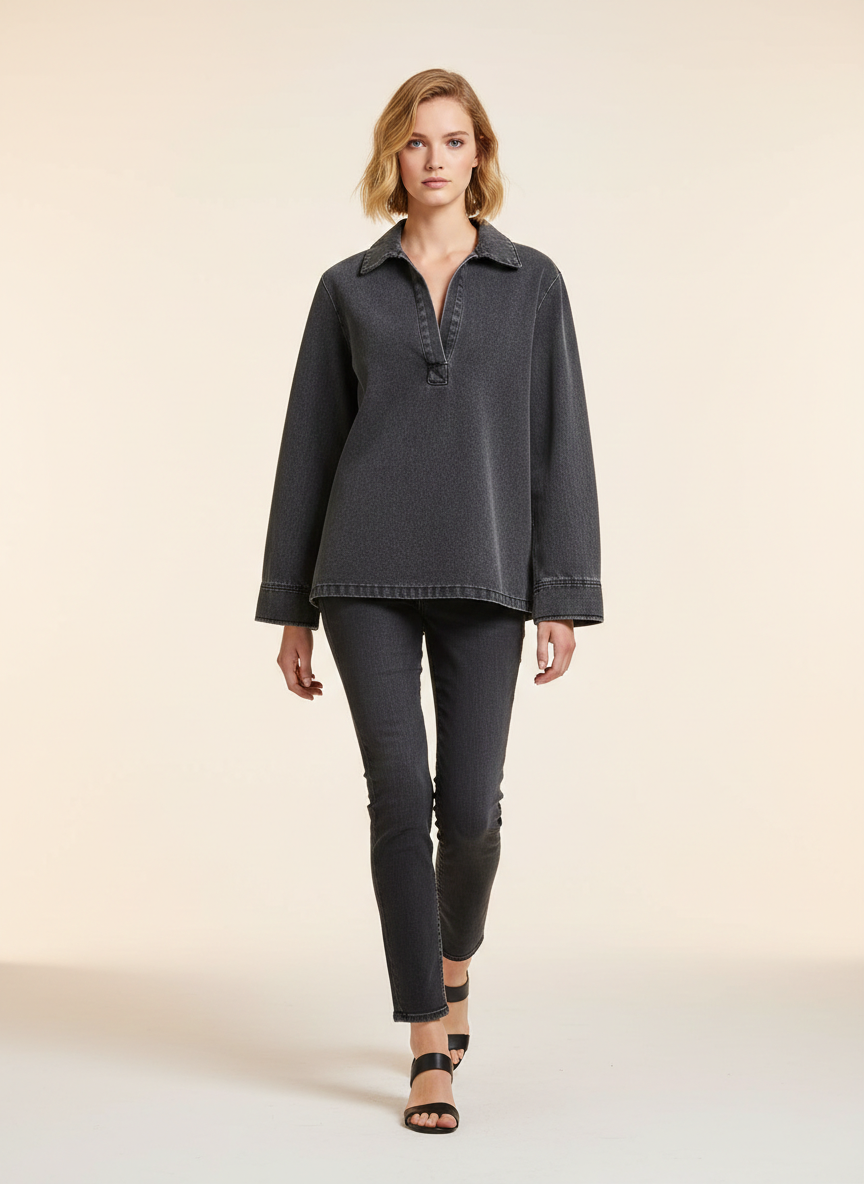 Casual todelt denimlook | Top med krave og højtaljede bukser til kvinder