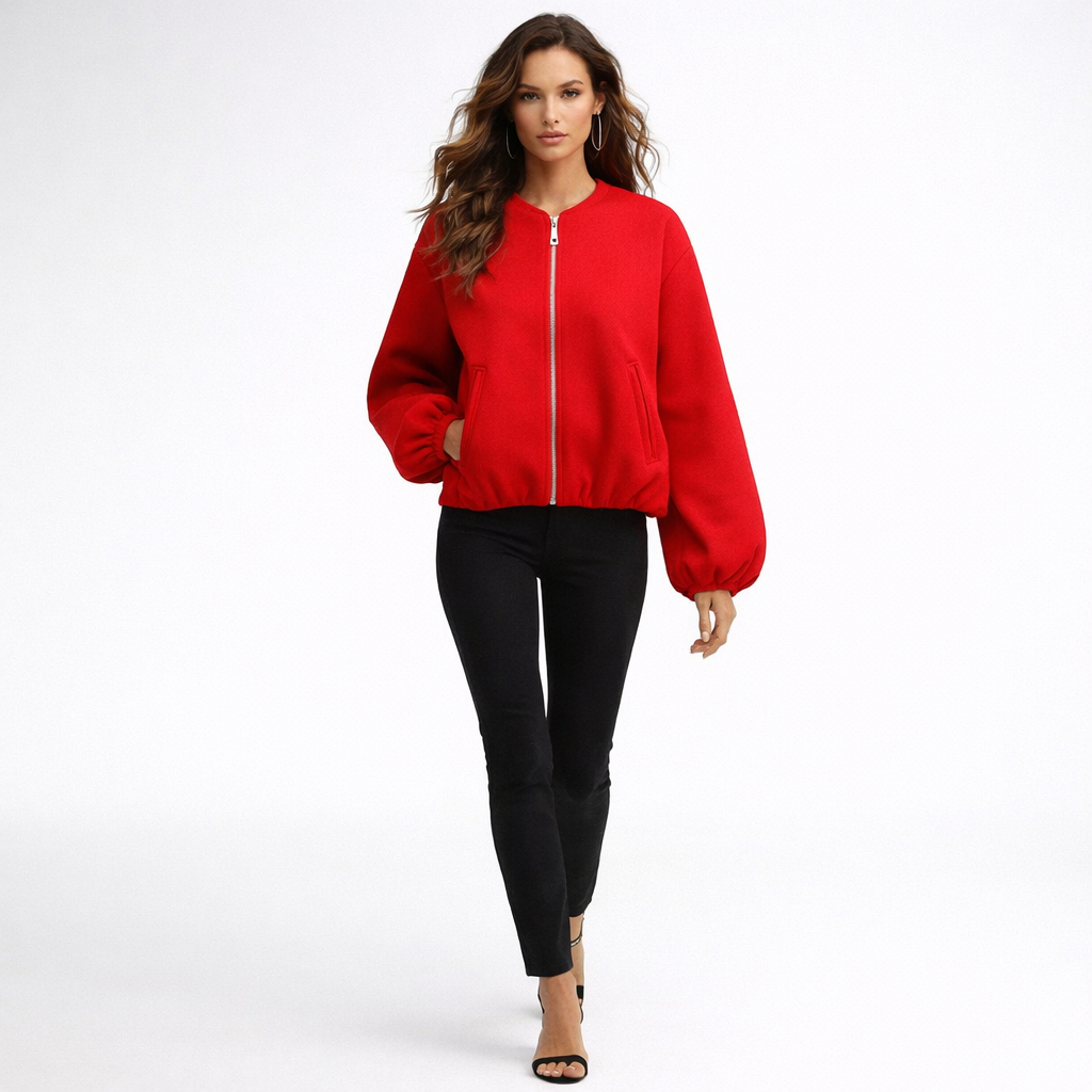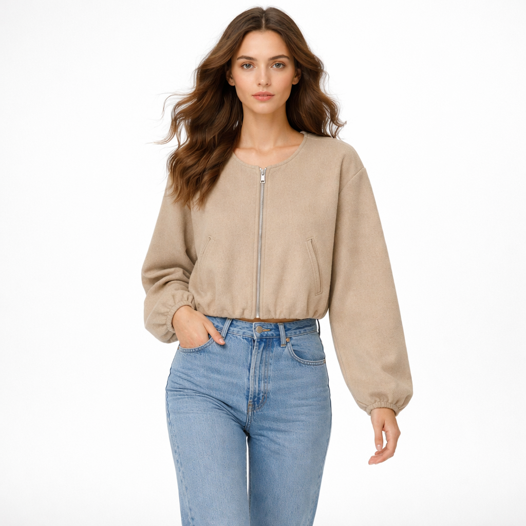 Cropped bomberjakke til kvinder med lynlås og ballonærmer