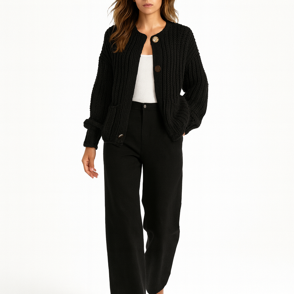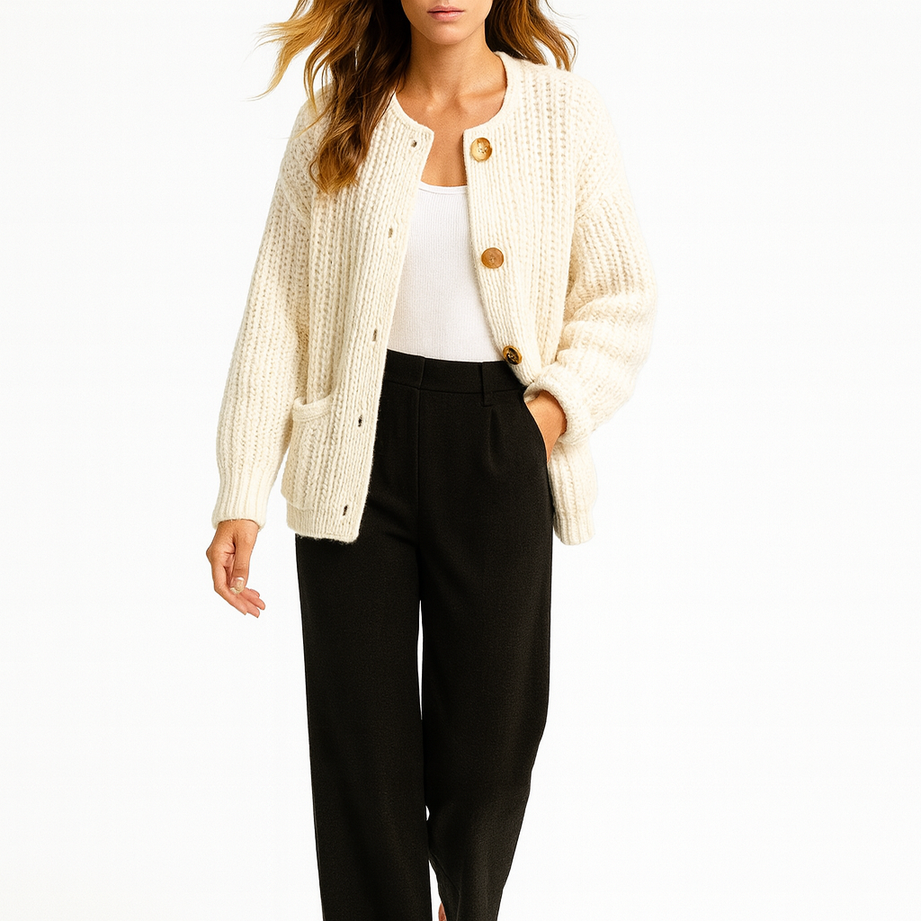 Denne klassiske strikcardigan kombinerer komfort og stil i ét tidløst design. Den løse pasform, runde hals og dekorative knapper gør den ideel til både afslappede og elegante hverdagslooks.
