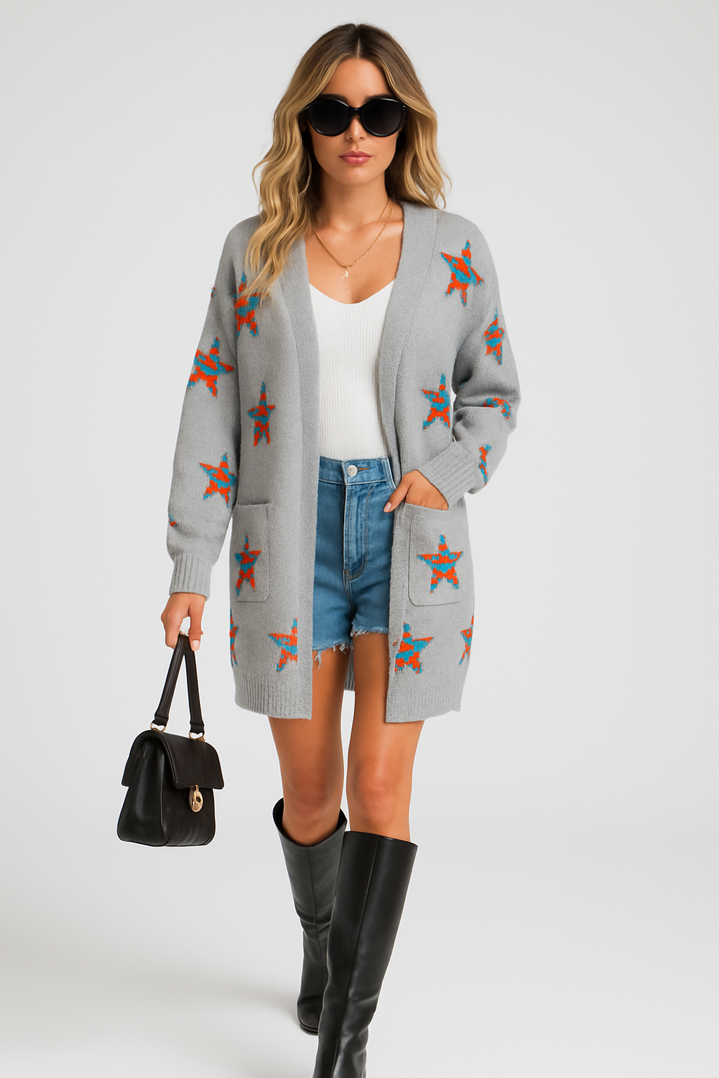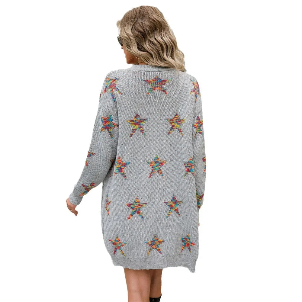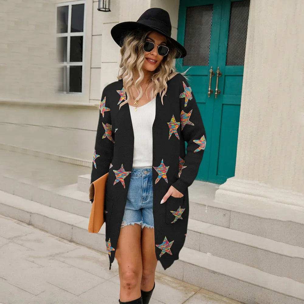 Dame cardigan i strik | Stjerneprint | Løs pasform med lommer