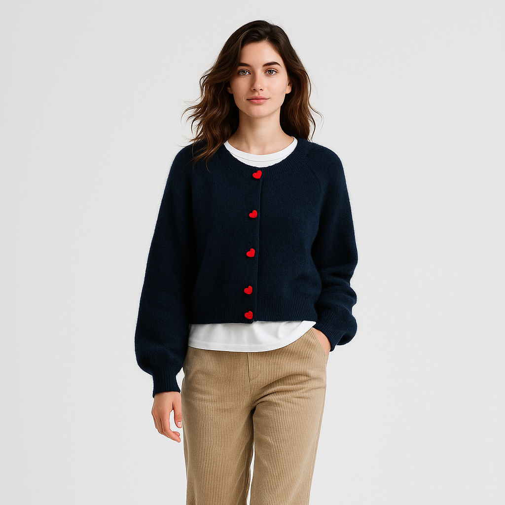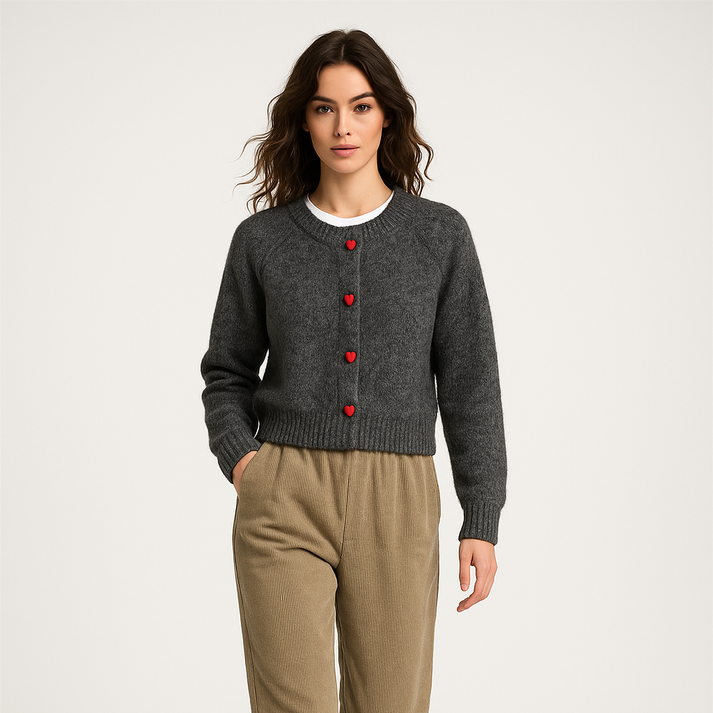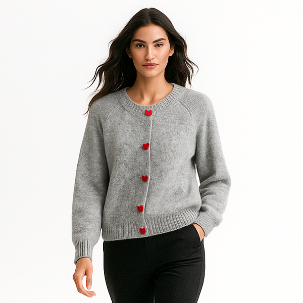 Denne søde og stilfulde cardigan i uld er et must-have til efterår og vinter. Den bløde tekstur, afslappede pasform og dekorative hjerteformede knapper giver et feminint og hyggeligt udtryk, perfekt til både hverdag og caféaftaler.