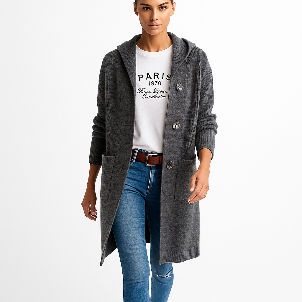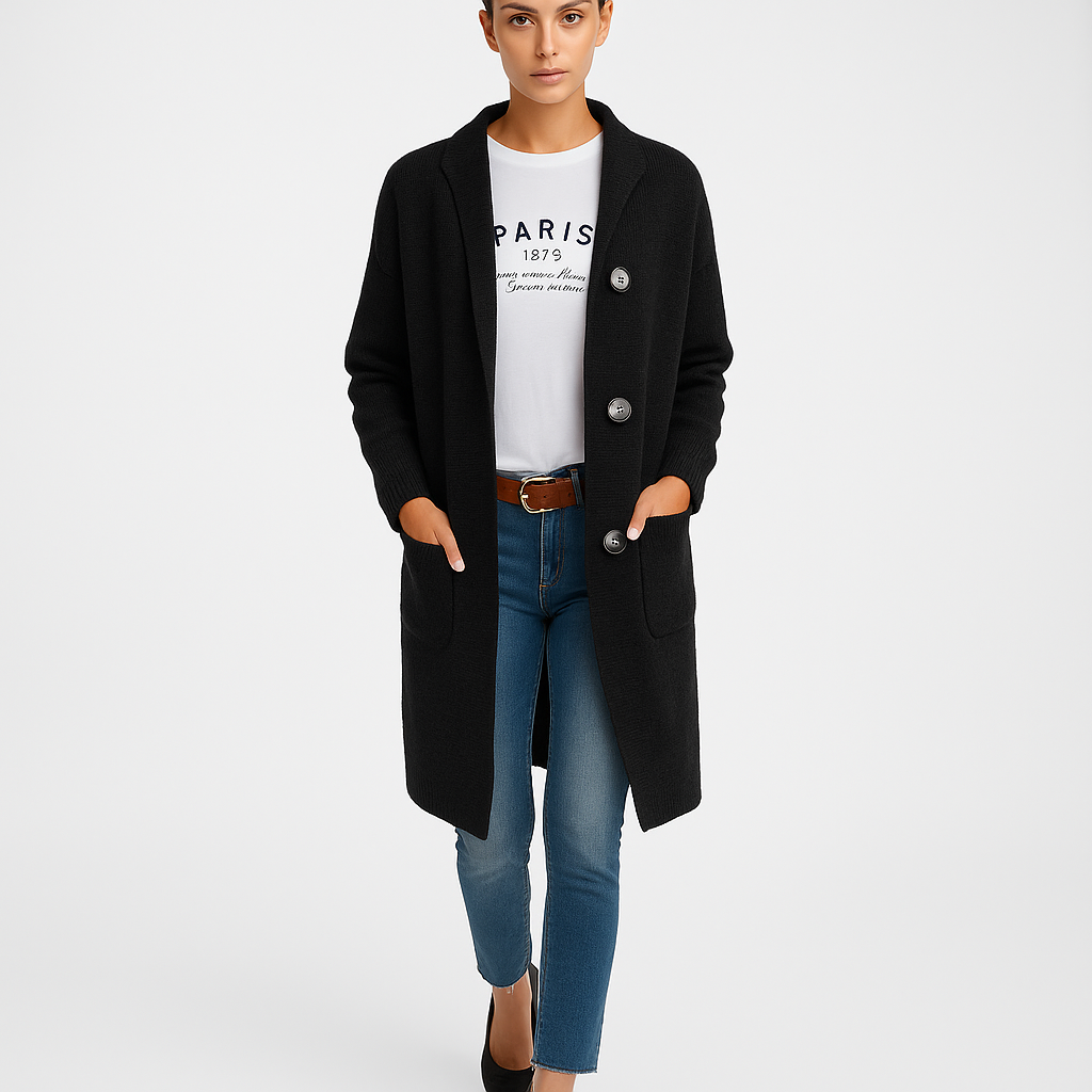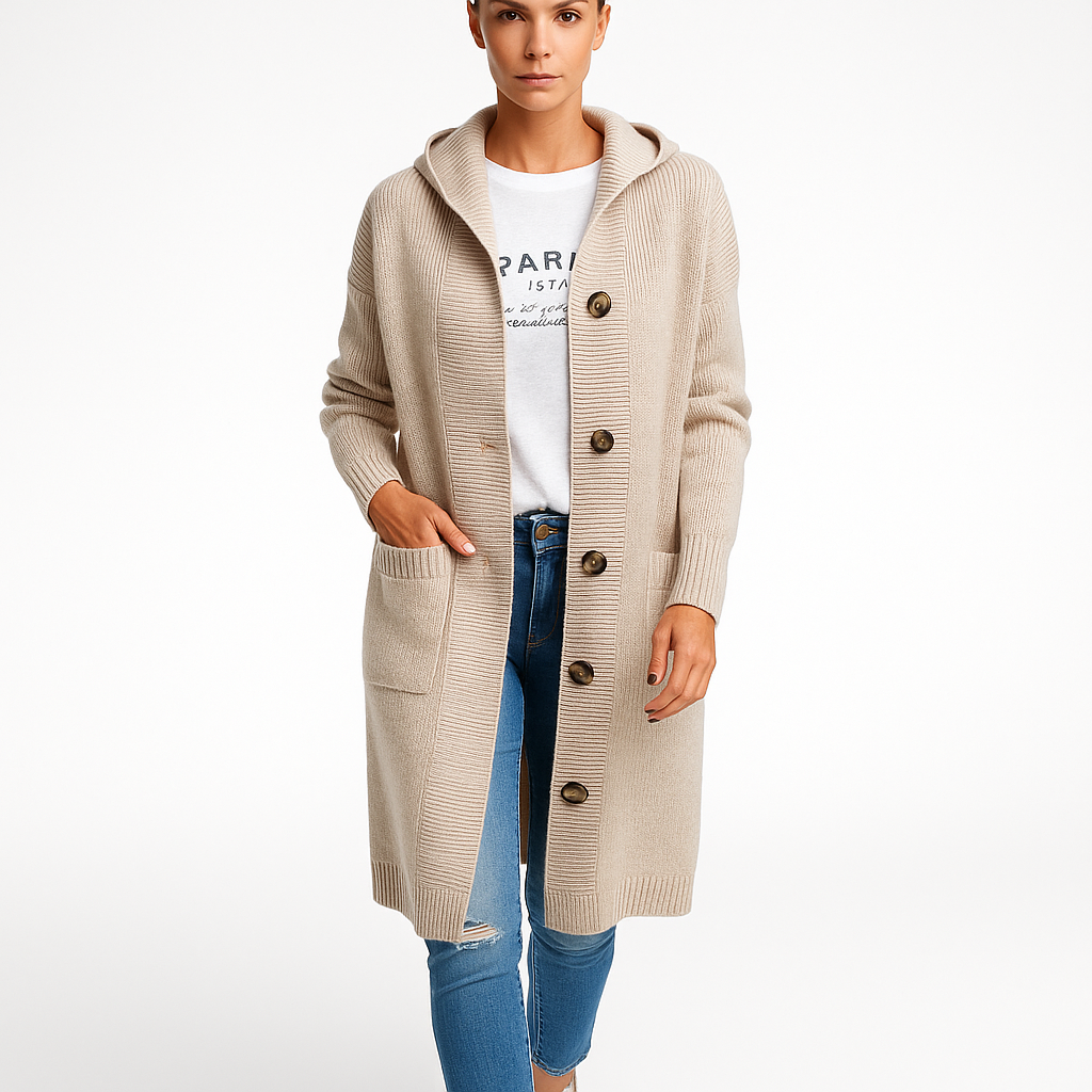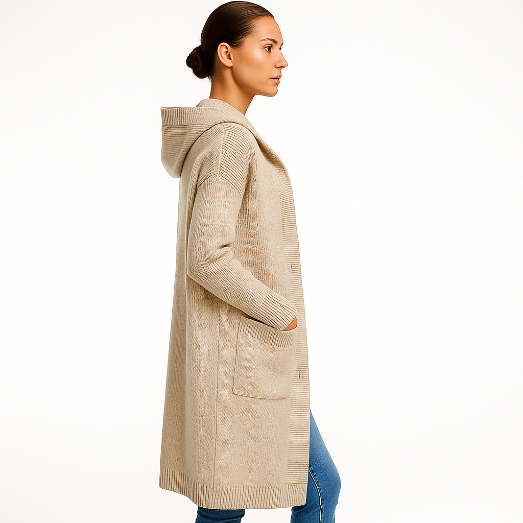 Oplev den perfekte kombination af varme, komfort og stil med denne lange vintercardigan til kvinder. Den feminine silhuet og lette struktur giver et tidløst look, der passer perfekt til lag-på-lag i kolde måneder.