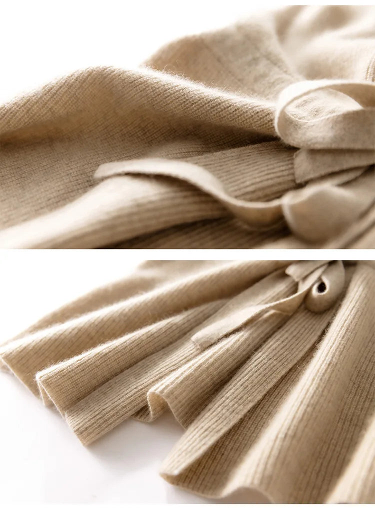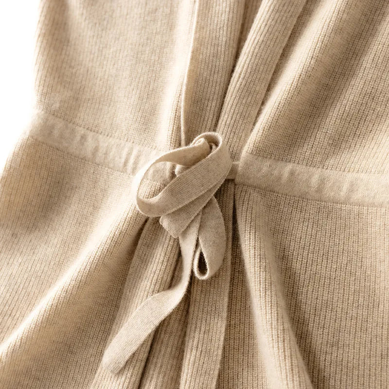 Denne luksuriøse uldvest kombinerer enkel elegance med tidløs komfort. Med sin bløde tekstur, feminine V-udskæring og bindebånd i taljen tilføjer den et sofistikeret lag til både hverdags- og kontorlooks.