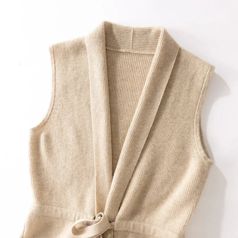 Dame strikvest i ren uld | V-udskæring | Ærmeløs cardigan med bindebånd