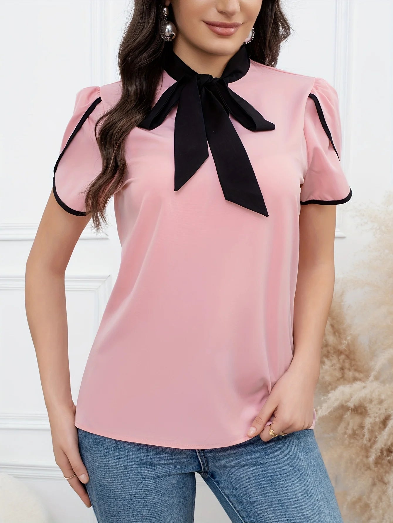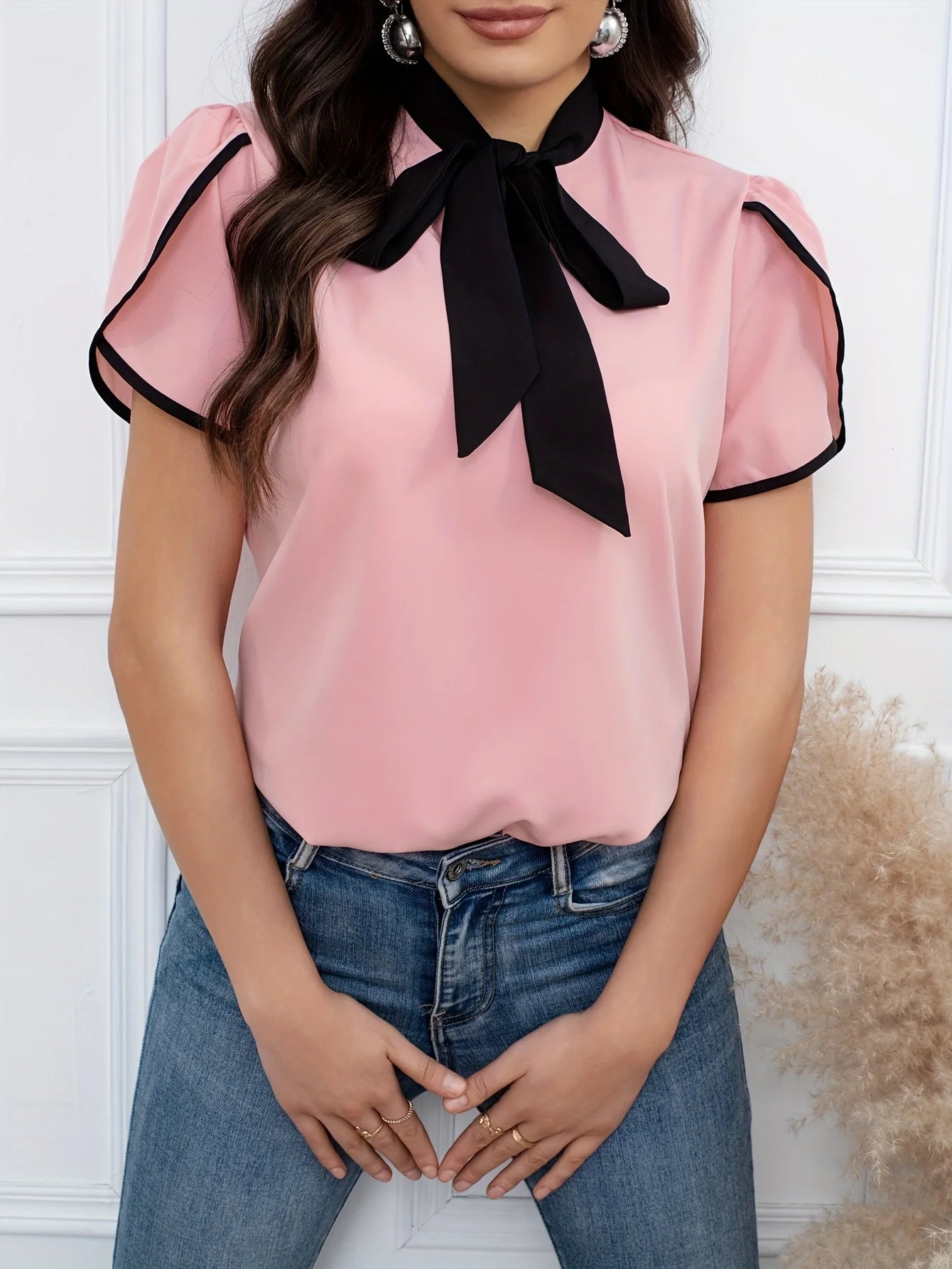Denne elegante bluse kombinerer let komfort med et feminint udtryk. Med sine luftige sommerfugleærmer og dekorative sløjfe ved halsen giver den et sofistikeret touch til både hverdag og kontor.