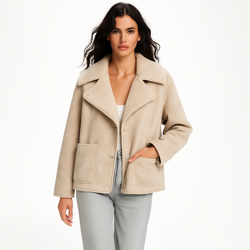 Denne moderne shearling-inspirerede jakke forener luksus og komfort. Med sin dobbeltsidede pelsstruktur, bløde foring og oversized pasform er den perfekt til kølige efterårs- og vinterdage – både praktisk og stilfuld.