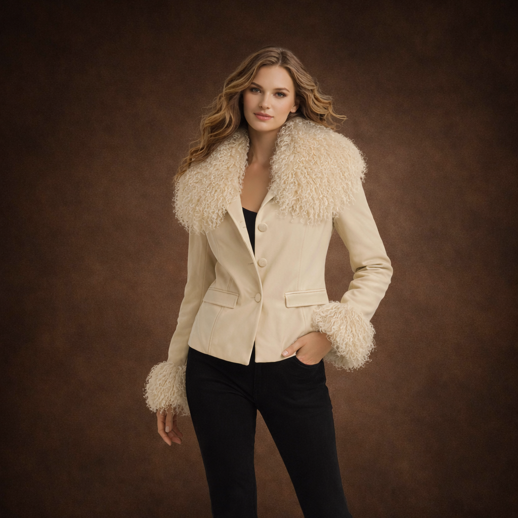 ✓ Naturlig pelsdetalje: Krave og manchetter er udført i ægte mongolsk fårepels, der tilfører volumen, blødhed og luksus.