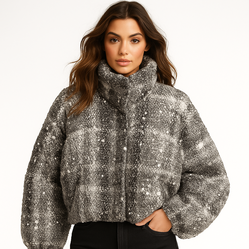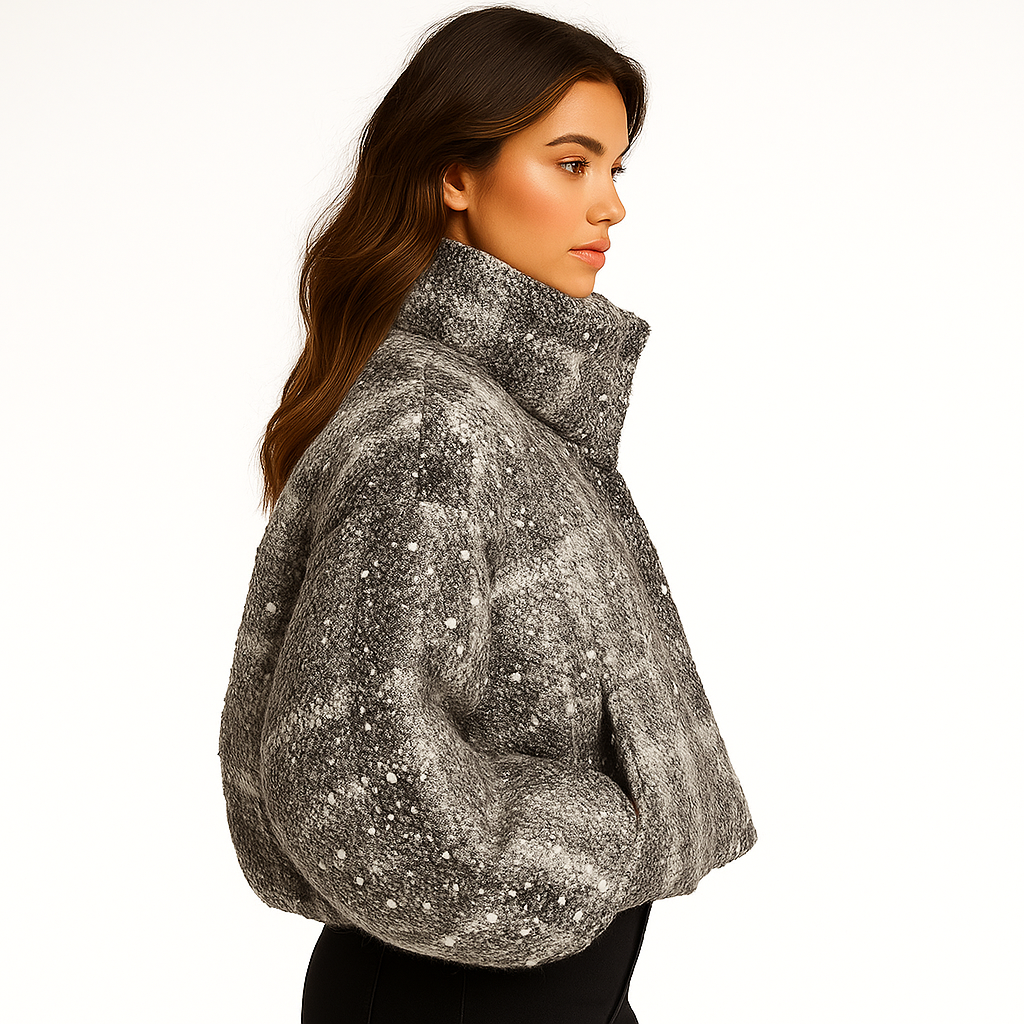 Denne luksuriøse dunkåbe kombinerer eksklusiv tweedstruktur med et diskret glitrende udtryk, der giver jakken et sofistikeret og moderne look. Den varme dunfyldning sikrer komfort og funktionalitet, uden at gå på kompromis med stil eller elegance.