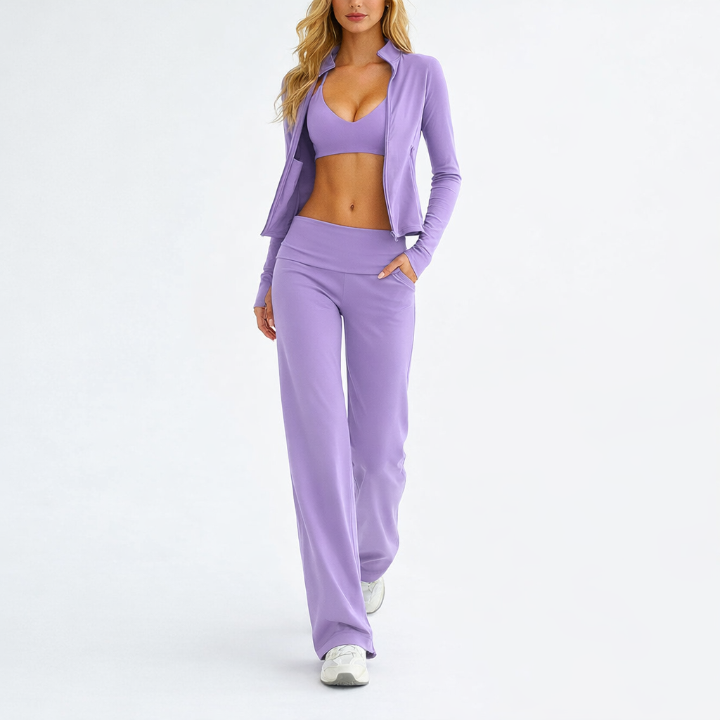 Elegant 3-delt træningssæt med jakke, top og vide bukser til kvinder