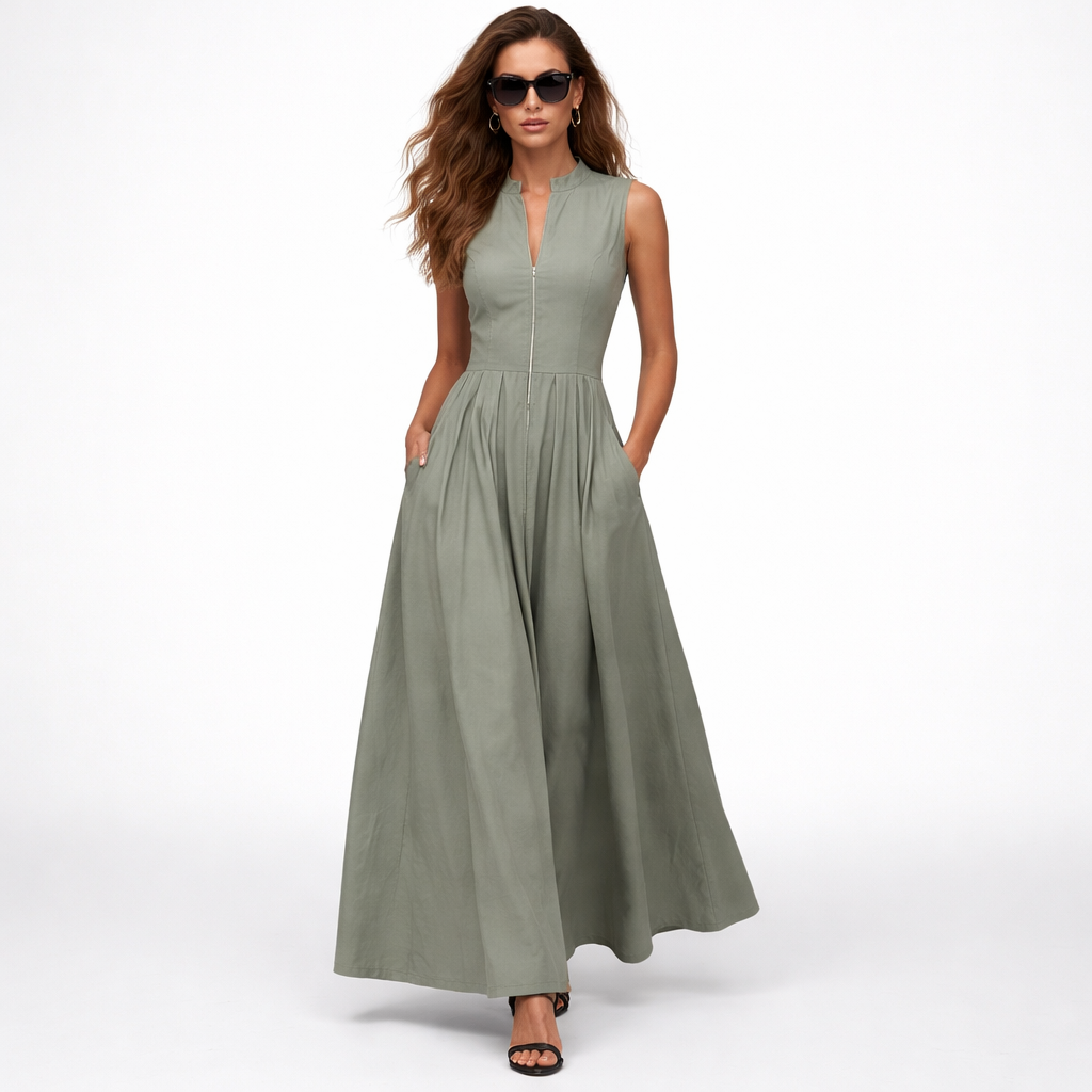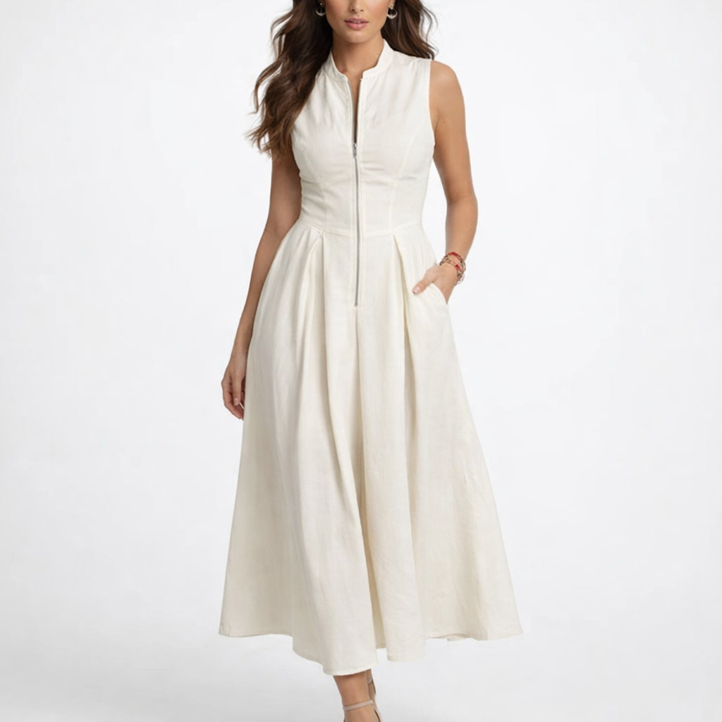 Elegant ærmeløs midi-kjole med lynlås og plisseret skørt