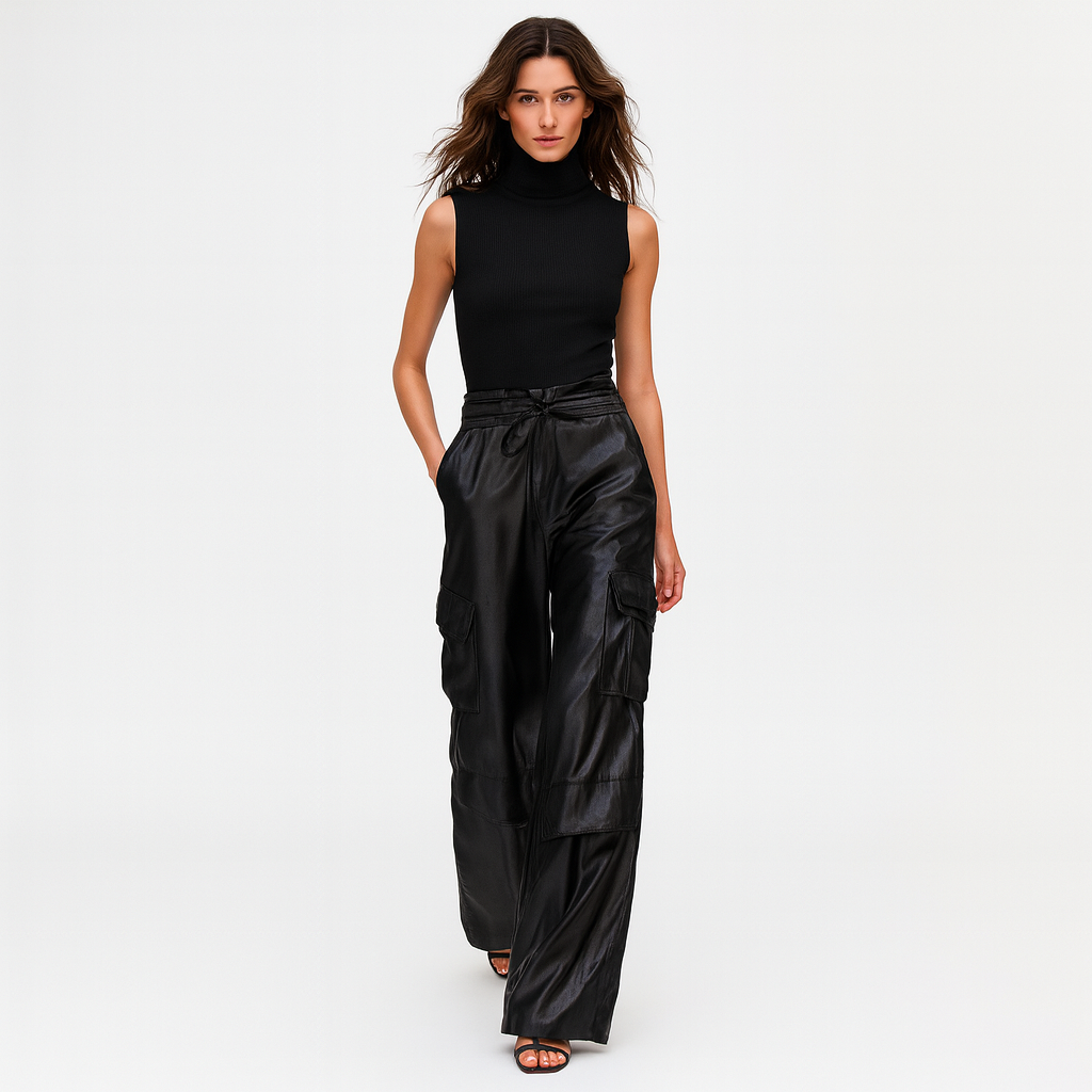Disse stilfulde cargobukser kombinerer et moderne, afslappet udtryk med feminine detaljer i et design, der er både komfortabelt og iøjnefaldende. Den let skinnende overflade og den dekorative talje giver bukserne et elegant twist, der fungerer til både hverdagsbrug og mere urbane outfits.