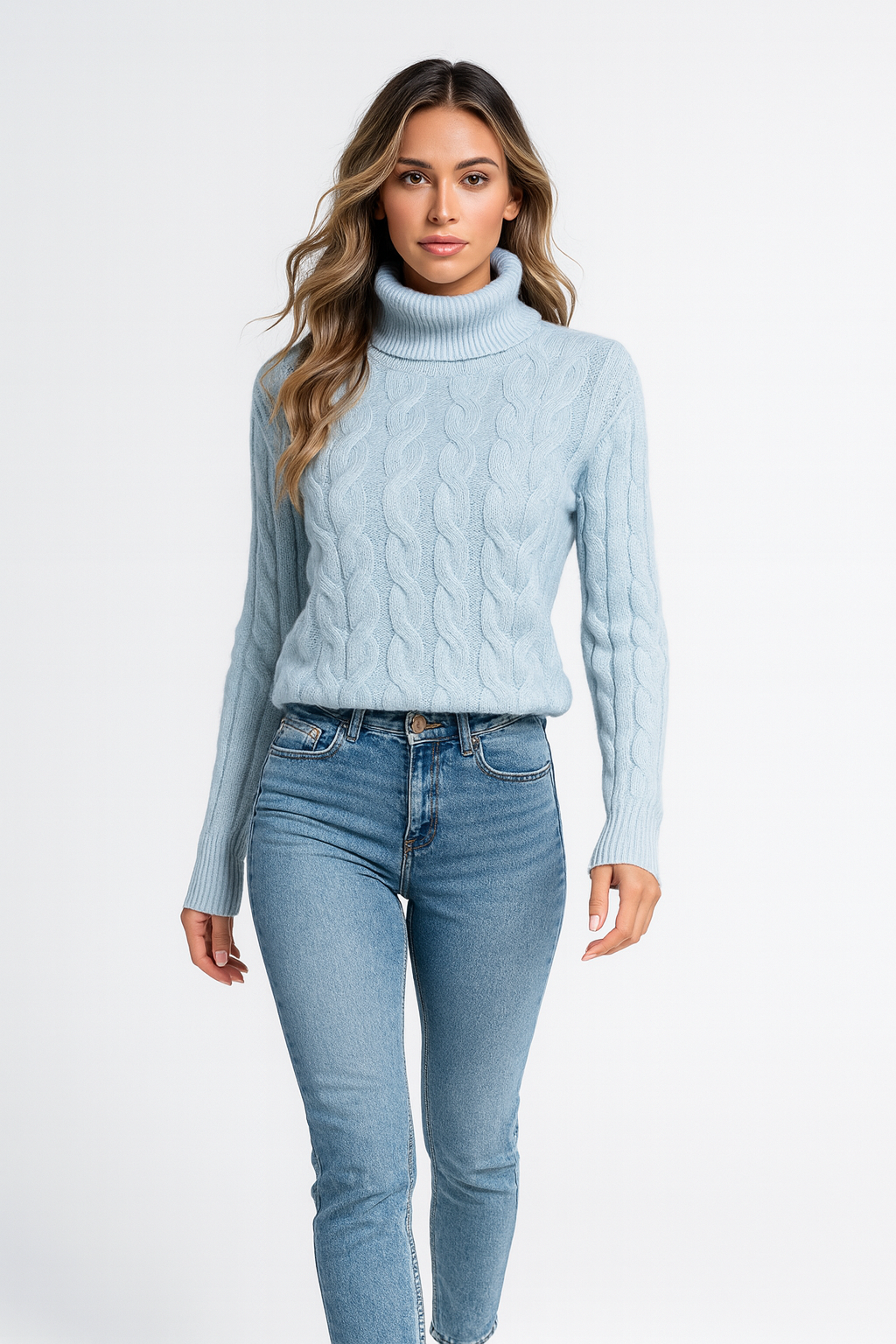 Oplev en tidløs og sofistikeret strik, der kombinerer klassisk kabelmønster med et blødt, højt rullekravesnit. Den perfekte pullover til dage, hvor du ønsker et velklædt, feminint og hyggeligt udtryk – både til arbejde, afslappede stunder og stilfulde hverdagslooks. Den strukturerede strik skaber et eksklusivt udtryk, der fremhæver din stil uden anstrengelse.