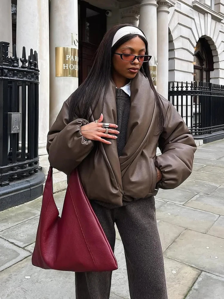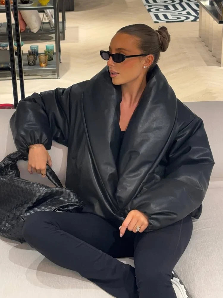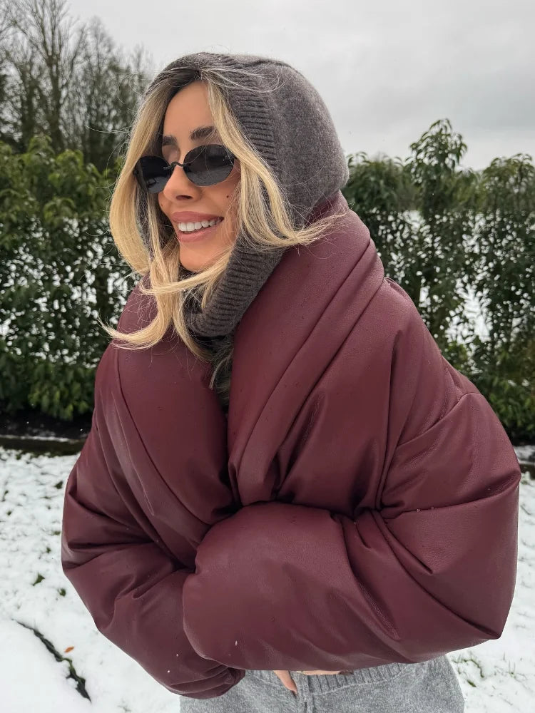 Elegant Kort Faux Leather Bomberjakke Med Voluminøs Krave