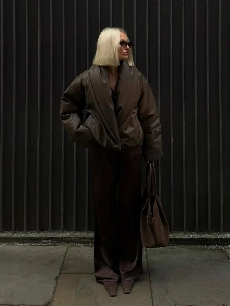 Denne moderne bomberjakke kombinerer en blød faux leather-overflade med en markant, omsluttende krave, der giver et eksklusivt og stilrent udtryk. Den korte silhuet og de voluminøse ærmer skaber en sofistikeret balance mellem komfort og urban elegance.