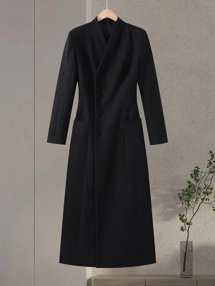 Elegant Lang Uldinspireret Frakke Med Skulderpuder Og Diagonal Knappelukning