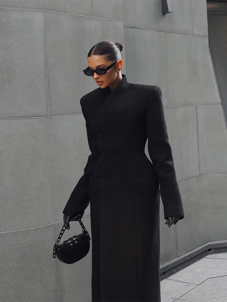 Denne lange, strukturerede frakke kombinerer en skulpturel silhuet med en elegant, diagonal lukning, der giver et moderne og sofistikeret udtryk. De markante skuldre og den taljedefinerede pasform fremhæver figuren på smukkeste vis og gør frakken ideel til både kontorbrug og elegante aftener.