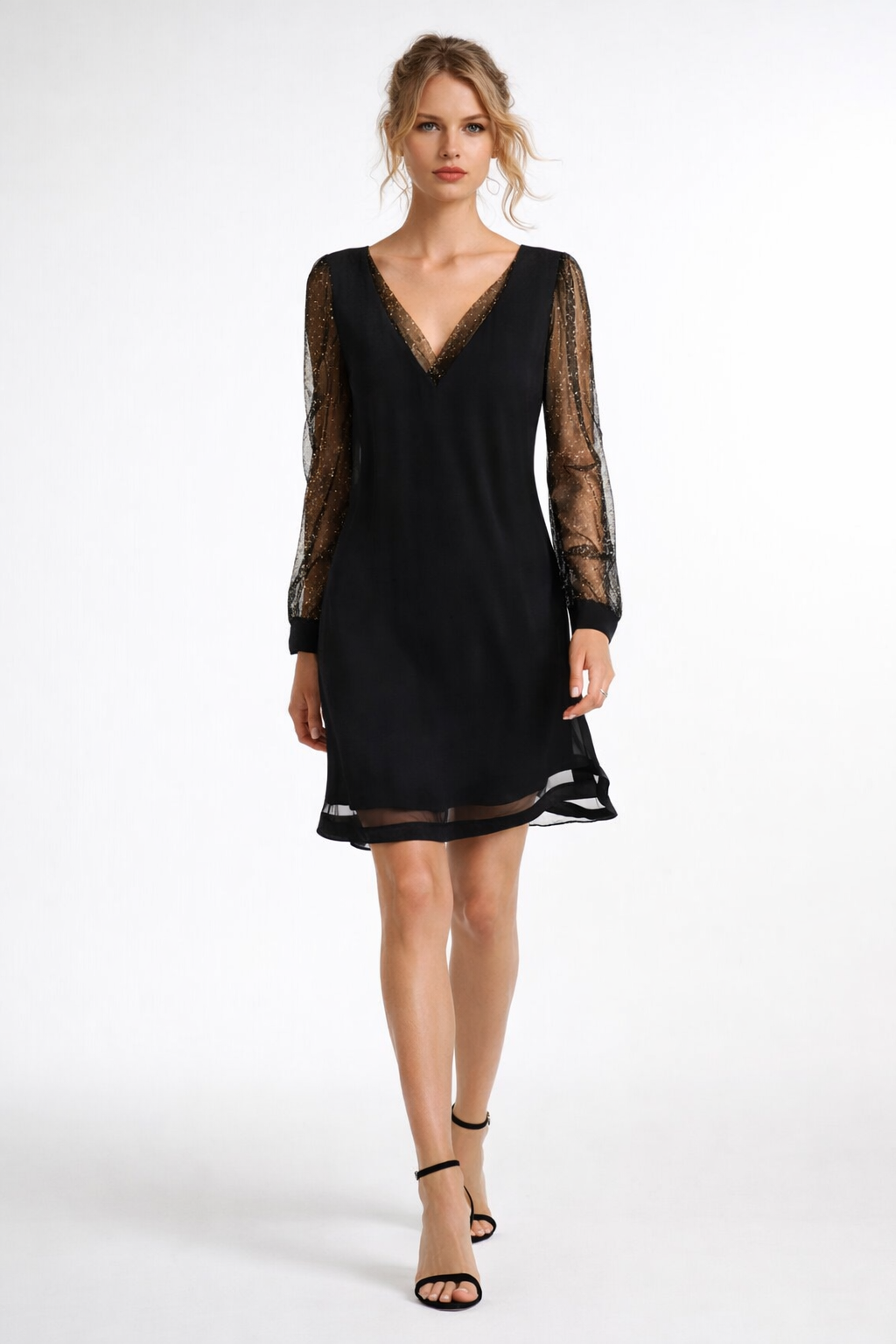 – Ærmer: Lange, let transparente ærmer