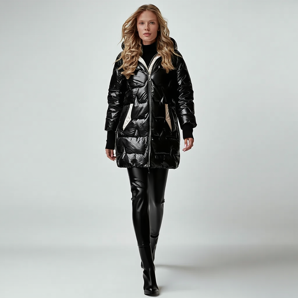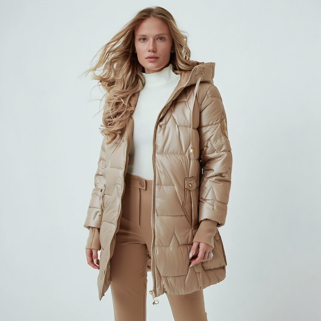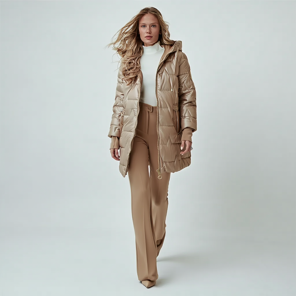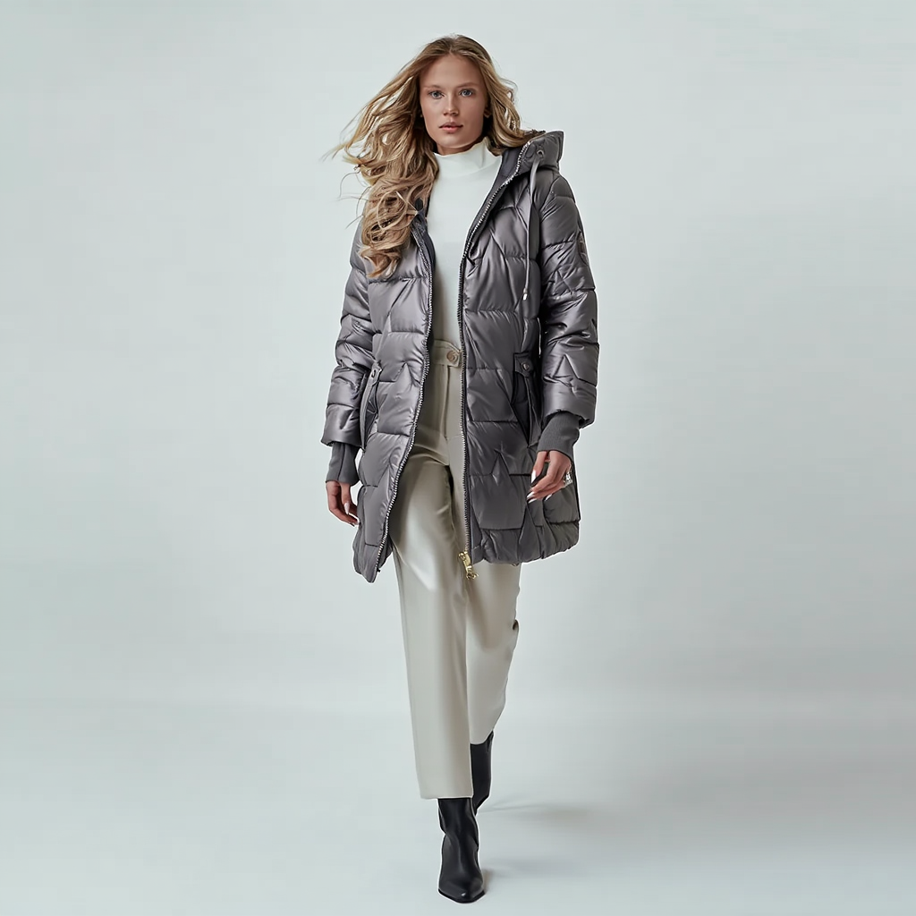 Hold dig varm med stil i denne elegante puffer vinterjakke til kvinder – en perfekt kombination af komfort, funktionalitet og moderne design. Den lette polstring og bløde materialeblanding giver fremragende varmeisolering, mens den justerbare hætte beskytter mod kulde og vind. Jakken har en elegant, figursyet pasform, der flatterer kroppen, og den er ideel til både hverdagsbrug og pæne lejligheder i efterårs- og vintersæsonen.
