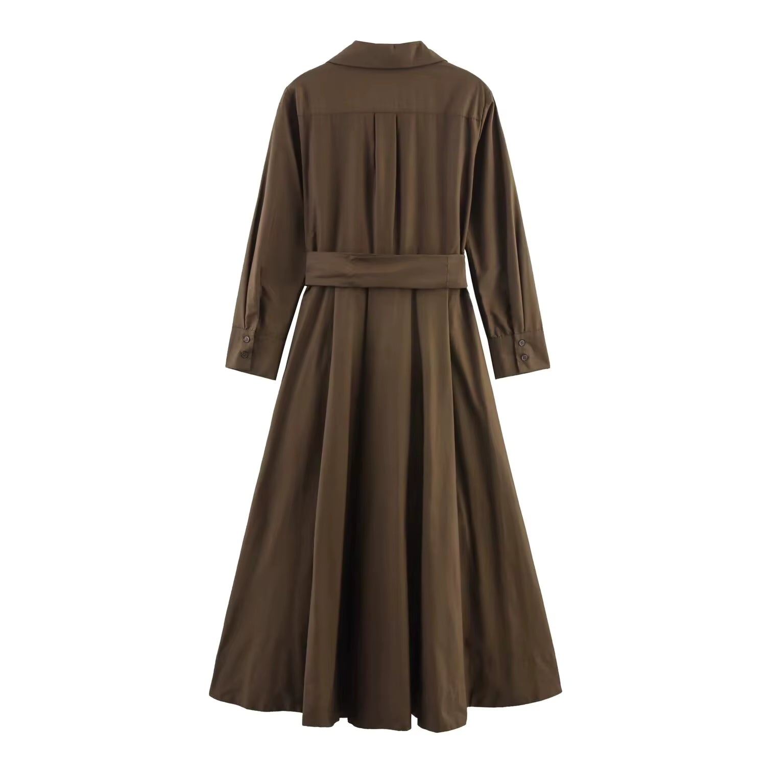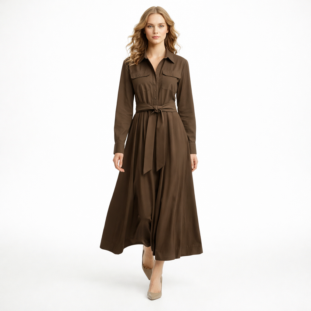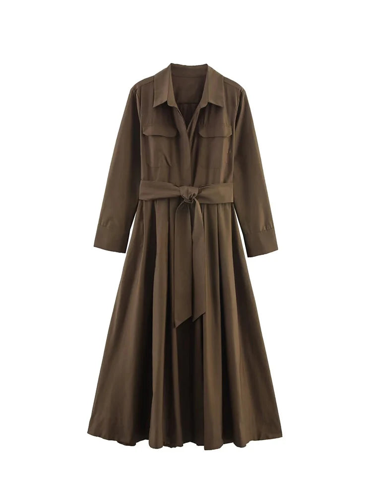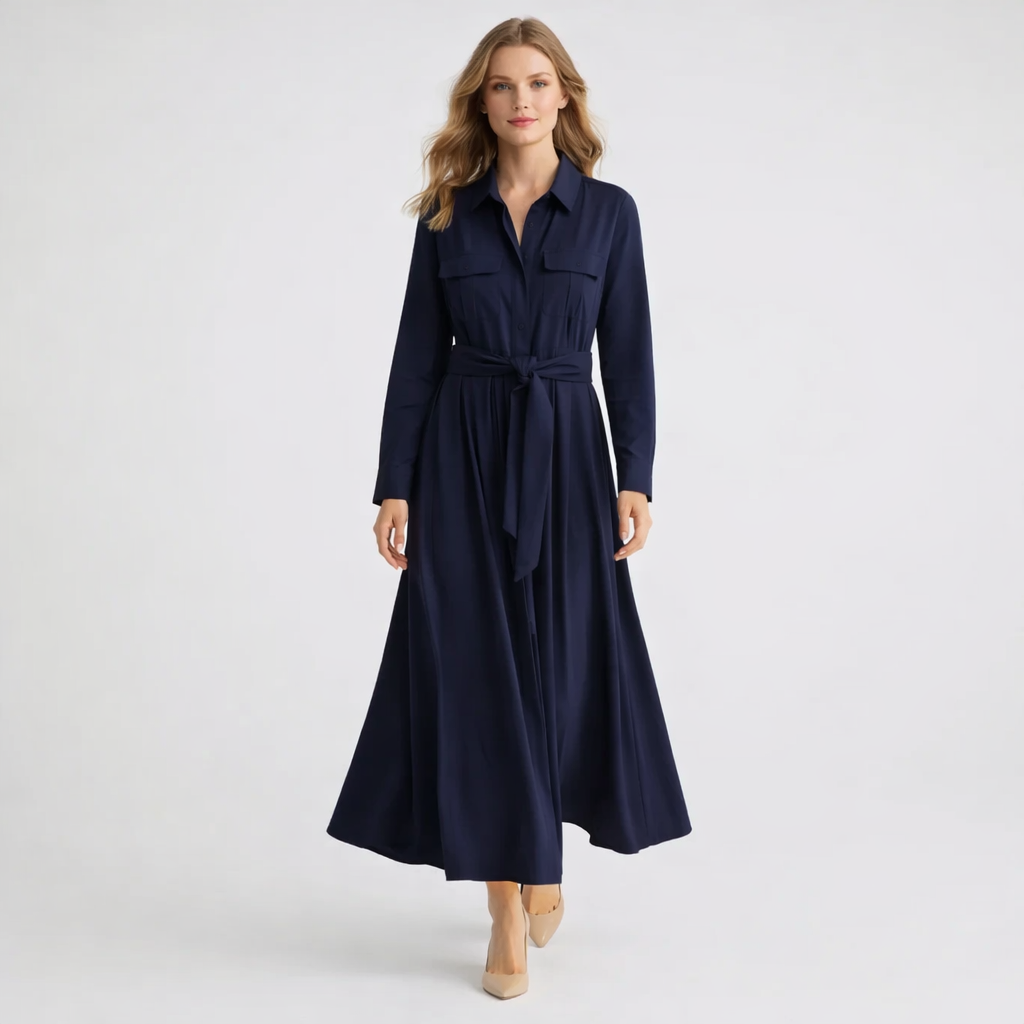 Elegant skjortekjole i midi-længde til kvinder med bindebælte og lange ærmer