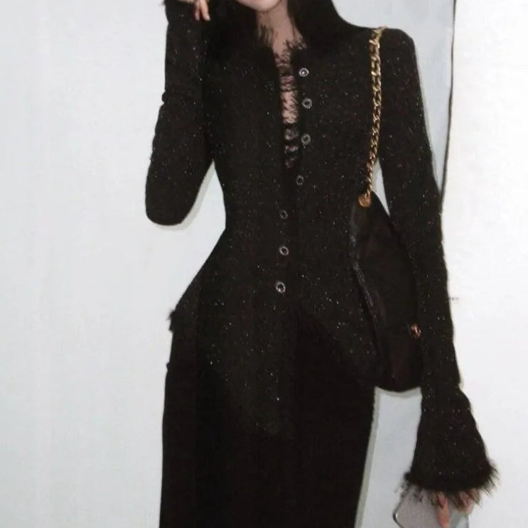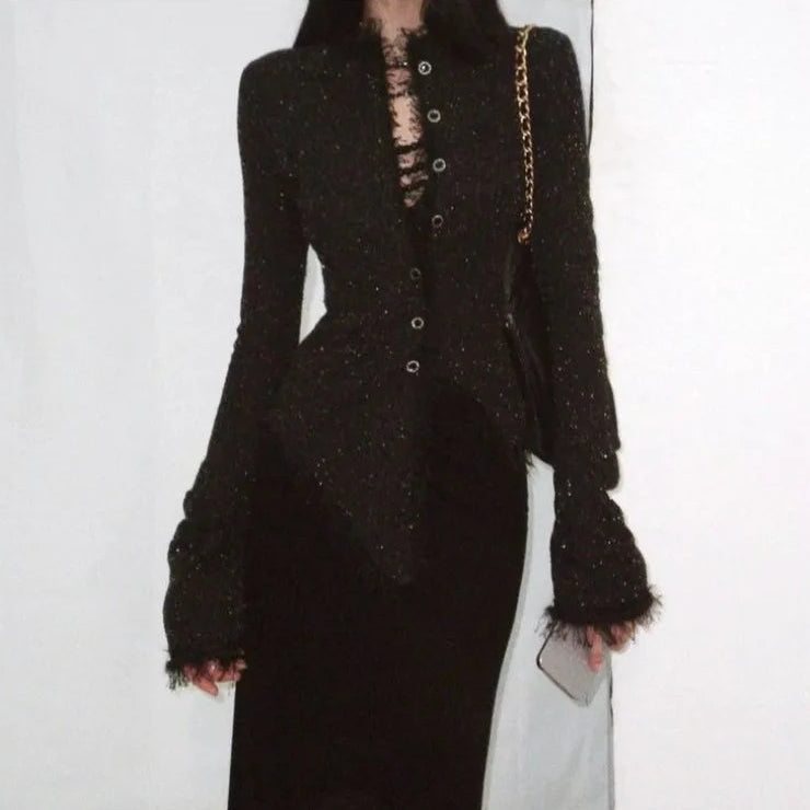 Elegant Sort Tweedjakke | Glitrende Slim Fit | Efterår & Vinter