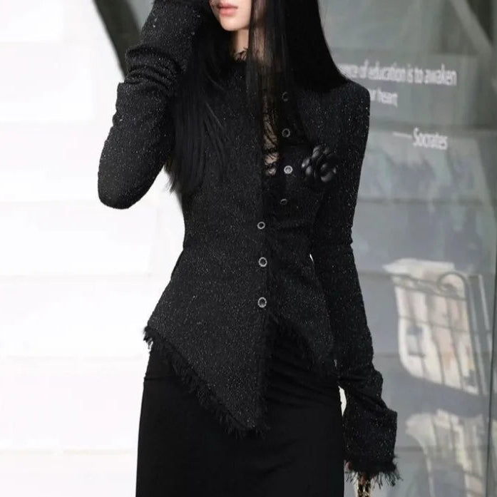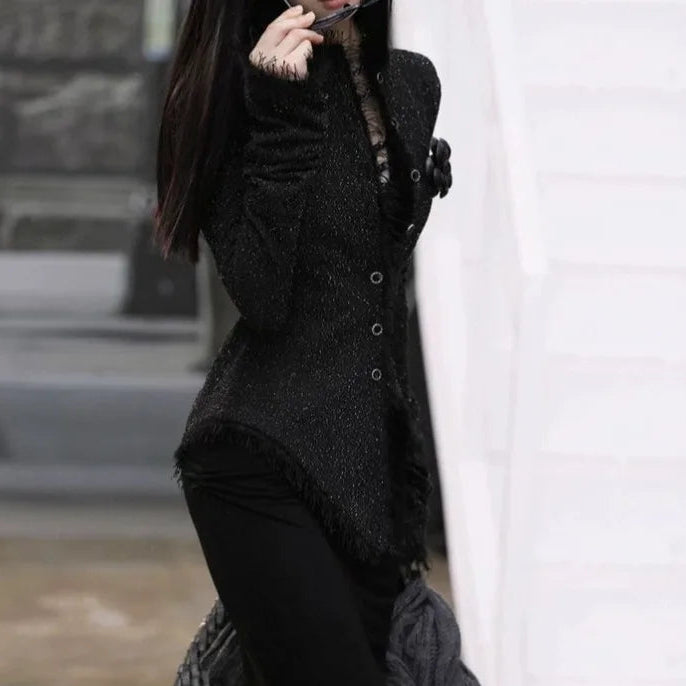 Tilføj et strejf af sofistikeret glamour til din garderobe med denne elegante sorte jakke i “small fragrance”-stil. Den skinnende tweed, figursyet pasform og asymmetriske kant skaber et luksuriøst og moderne udtryk - perfekt til både dag og aften.