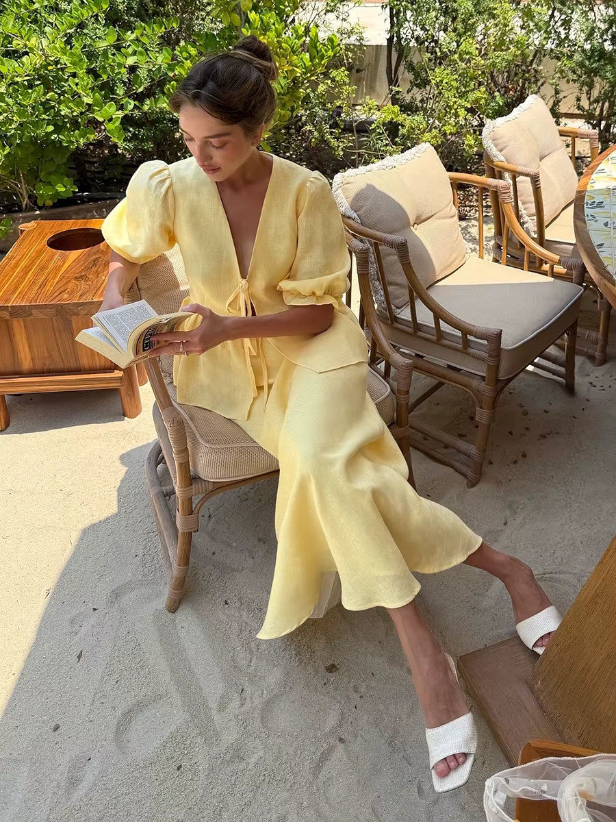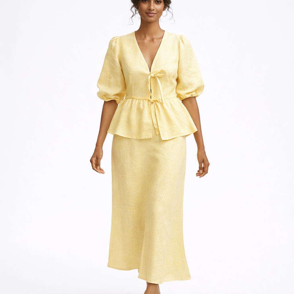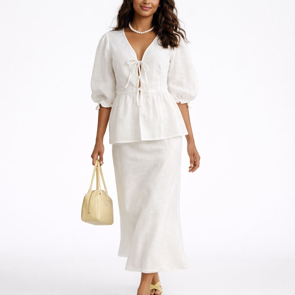 Elegant todelt sæt i bomuld med V-udskæring og lang nederdel