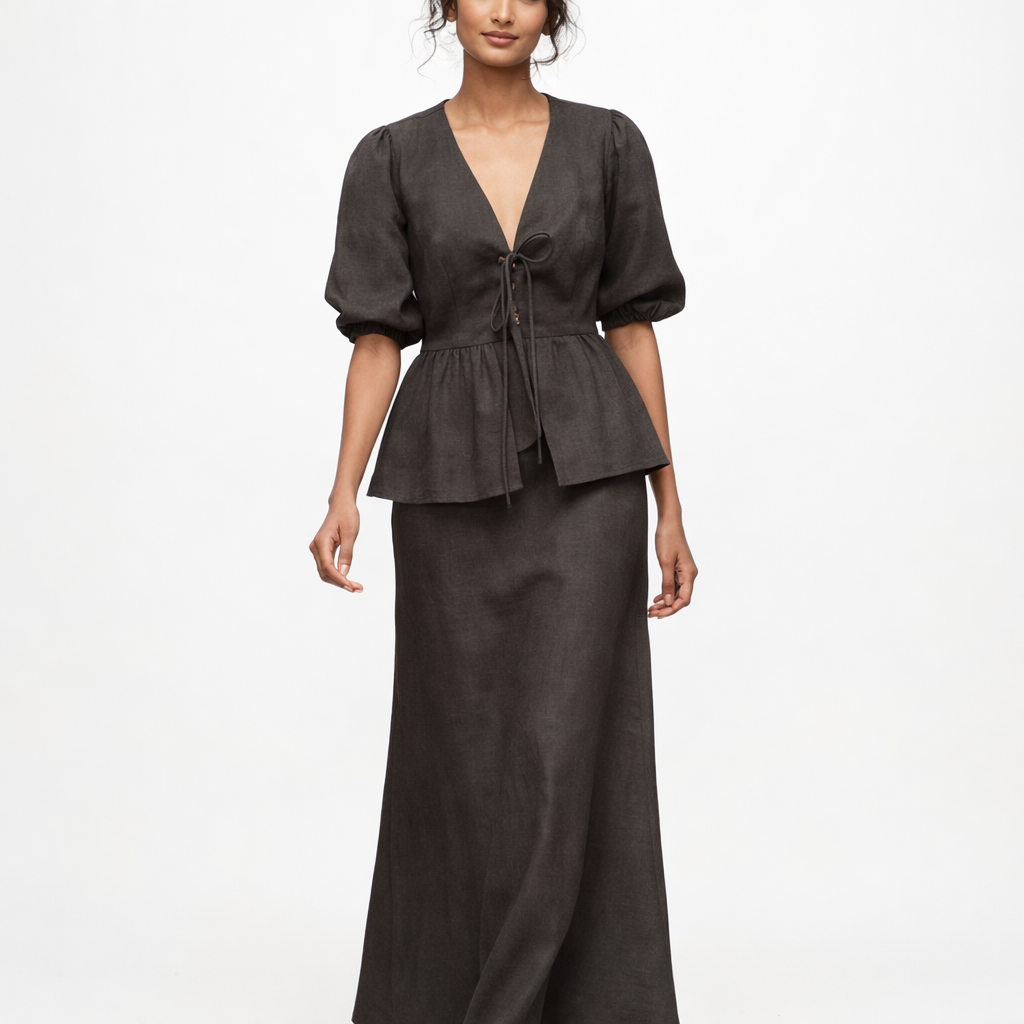– Sæt: Overdel med V-udskæring og bindedetalje + lang nederdel