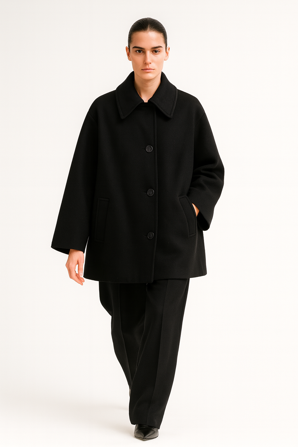 Oplev tidløs elegance og moderne komfort med denne sofistikerede uldfrakke i afslappet snit. Den bløde kvalitet og flatterende midilængde gør den ideel til efterårsdage, hvor stil og varme går hånd i hånd. Perfekt til både arbejde, byliv og afslappede sammenkomster.