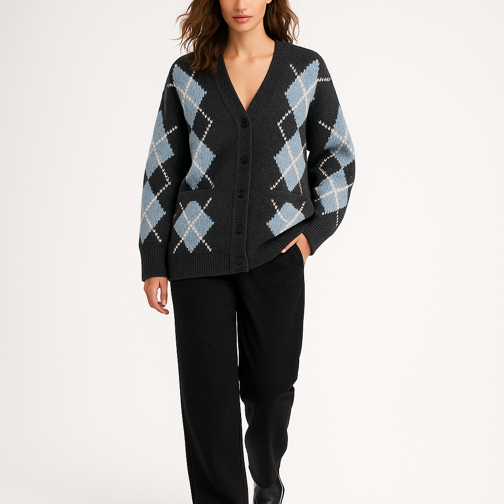 Denne klassiske cardigan kombinerer et tidløst argyle-mønster med en blød og komfortabel strikkvalitet. Den løse silhuet giver et afslappet, men stadig sofistikeret udtryk, perfekt til både arbejde og hverdagsbrug.