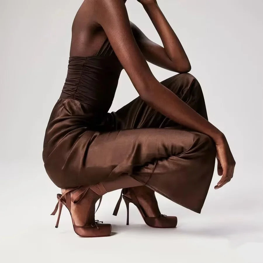 Elegante Høje Hælsko I Satin Med Ankelbånd Og Firkantet Snude