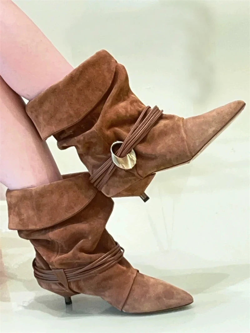 Oplev sofistikeret vinterstil med disse moderne ankelstøvler i vintage-look. De har et unikt foldet design og spids tå, som giver et elegant og tidløst udtryk – perfekte til både hverdagsbrug og aftenens events.