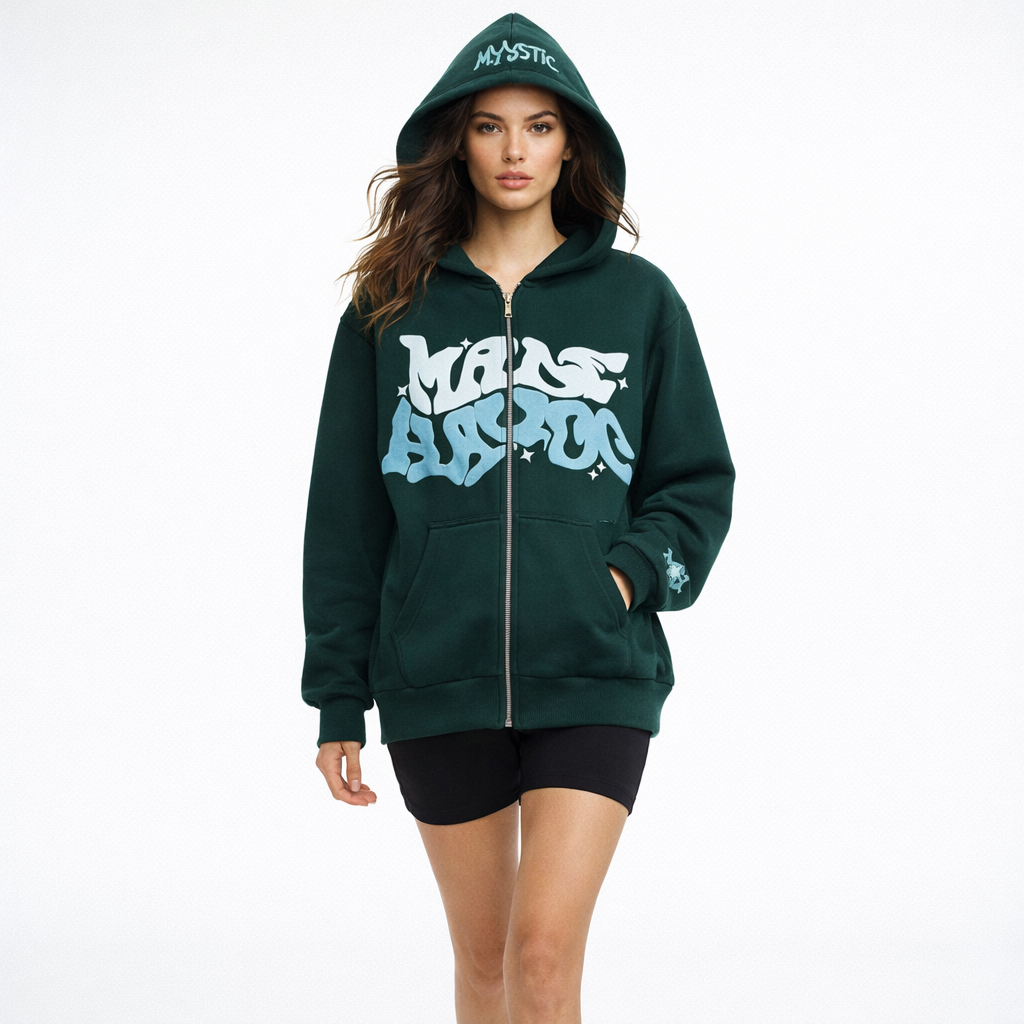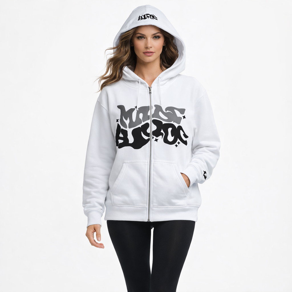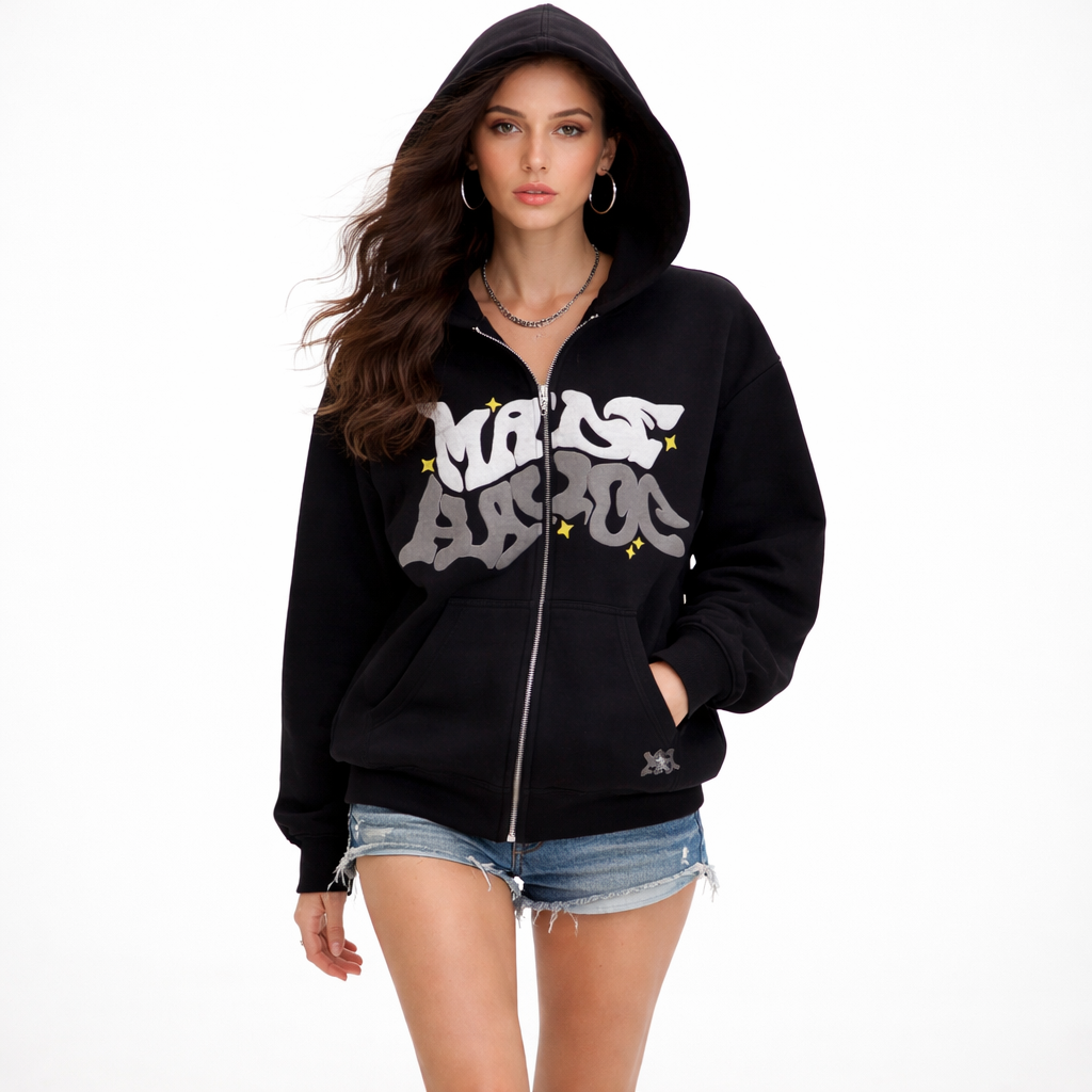 Denne hættetrøje kombinerer et moderne streetwear-udtryk med komfortabel funktionalitet i et afslappet design. Det markante grafiske print skaber personlighed, mens den gennemgående lynlås gør den nem at style til både hverdagsbrug og afslappede anledninger.