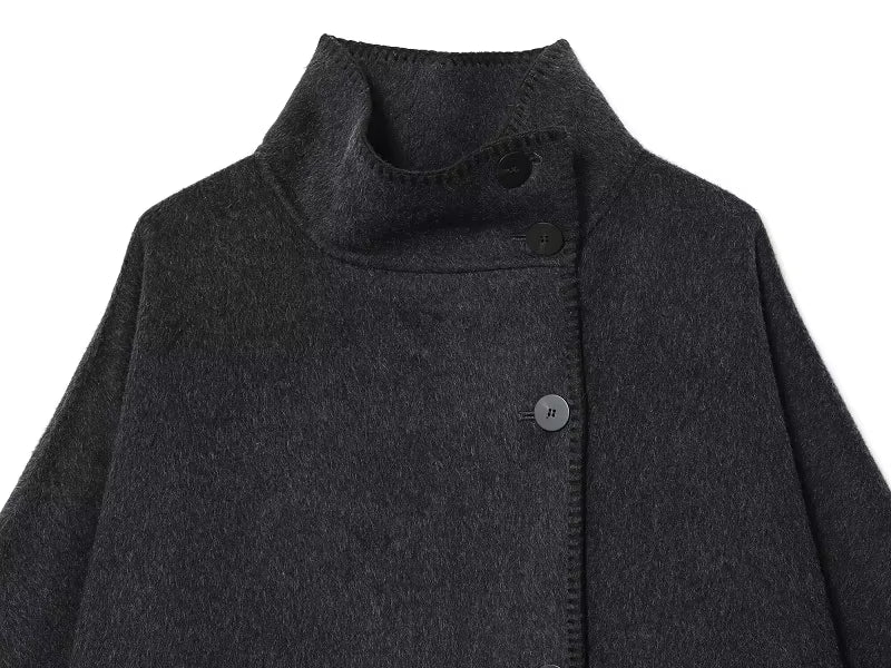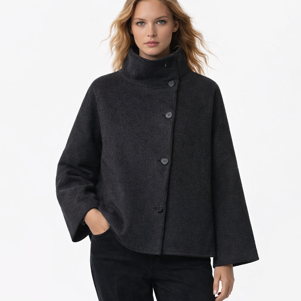 ✓ Elegant design: Asymmetrisk knaplukning for et sofistikeret udtryk.