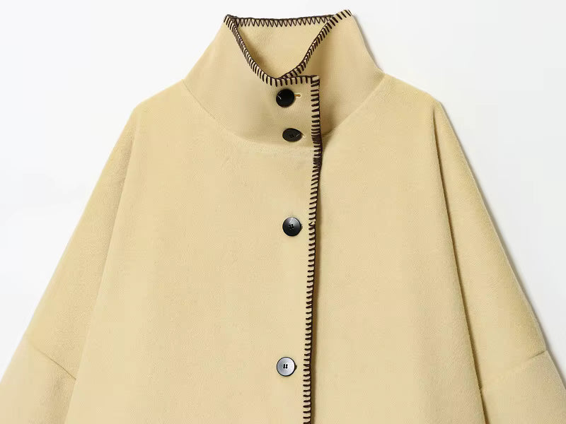 Denne jakke i kunstuld kombinerer minimalistisk design med luksuriøs komfort. Den høje krave beskytter mod kulde, mens det bløde materiale giver en behagelig og stilfuld følelse. Med sin løse pasform og asymmetriske knaplukning er den perfekt til både hverdag og mere elegante lejligheder.