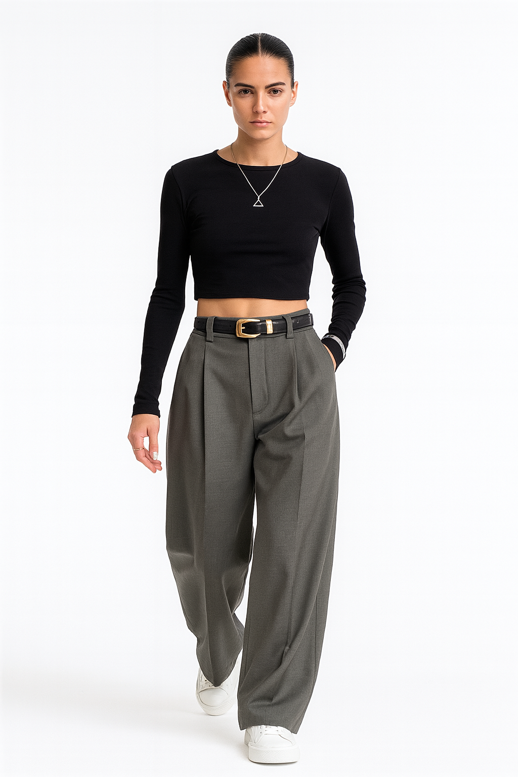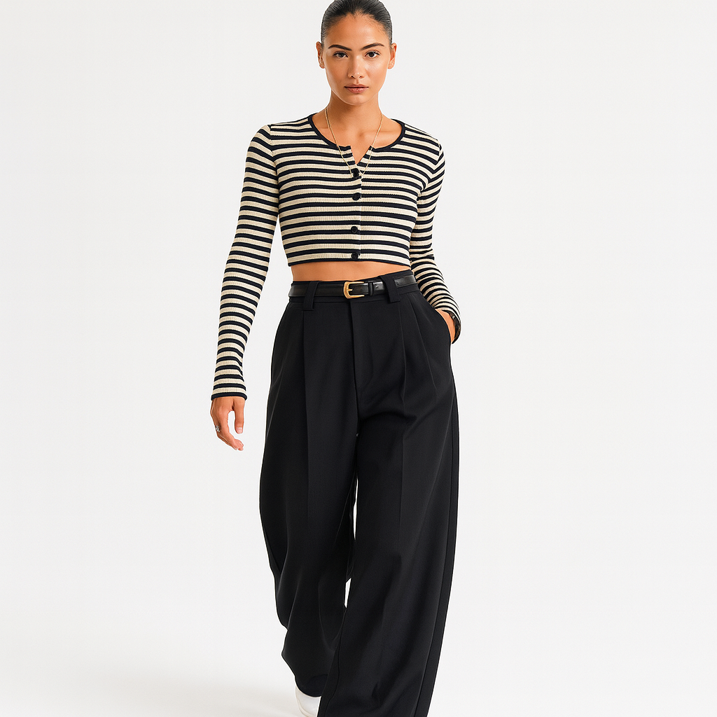 Opgrader din hverdagsstil med disse klassiske habitbukser til kvinder – designet til at forene komfort, struktur og feminin elegance. Den høje talje og vide ben skaber en tidløs silhuet, perfekt til kontor, møder og stilfulde fritidslooks.