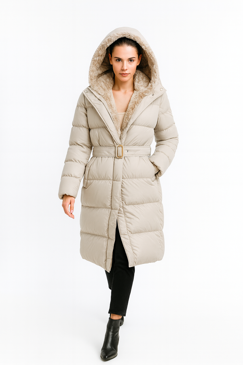 Hold varmen med stil i denne moderne kortmodel dunjakke, der kombinerer funktion, komfort og et elegant snit. Den justerbare talje med bælte fremhæver figuren, mens den bløde hætte og lette polstring giver optimal varme til kolde dage.