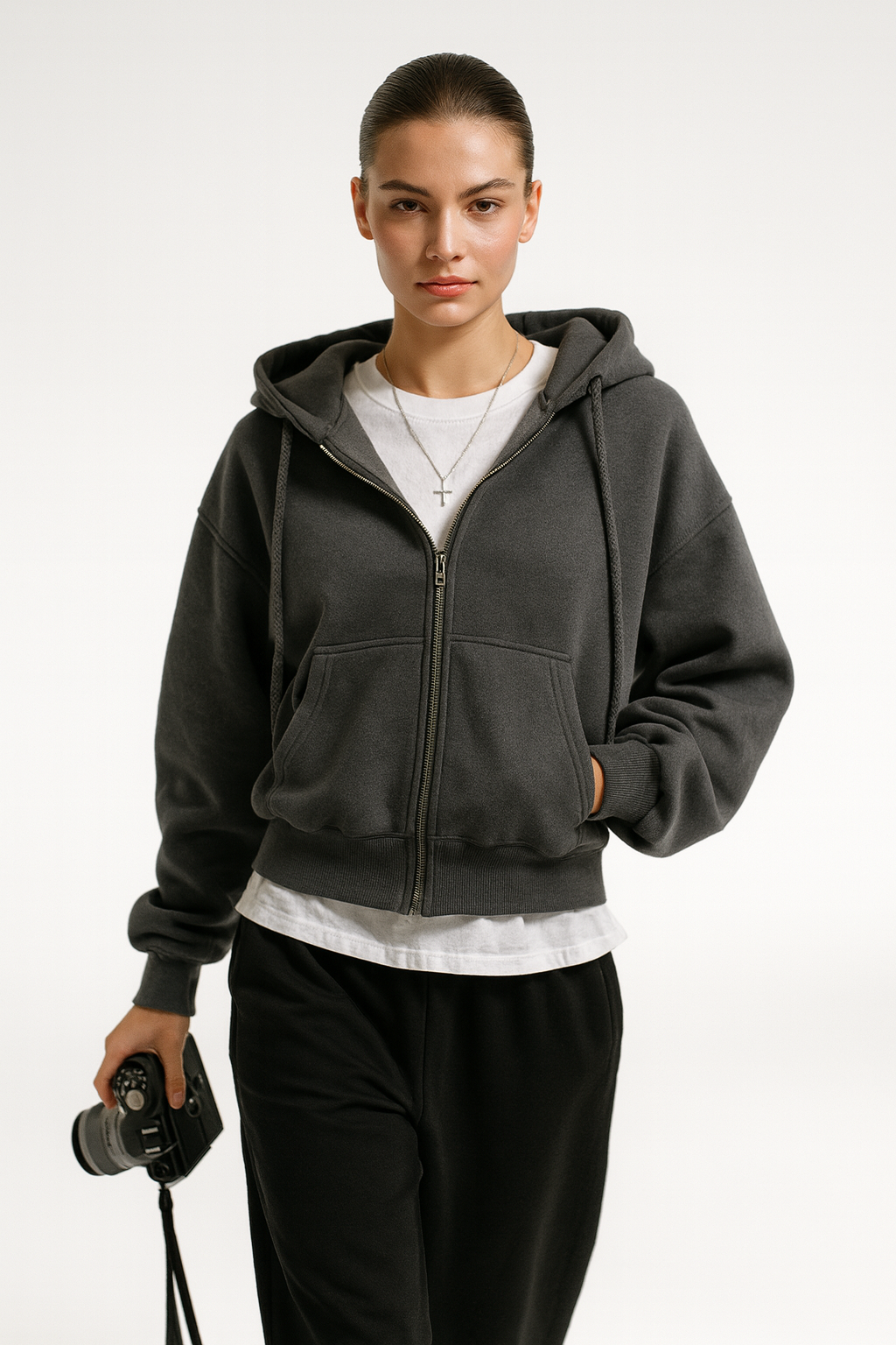Tilføj et moderne og afslappet touch til din garderobe med denne korte hættetrøje. Det tidløse design og den bløde kvalitet gør den perfekt til hverdagsbrug – ideel til både gåture, rejser og afslappede dage derhjemme.