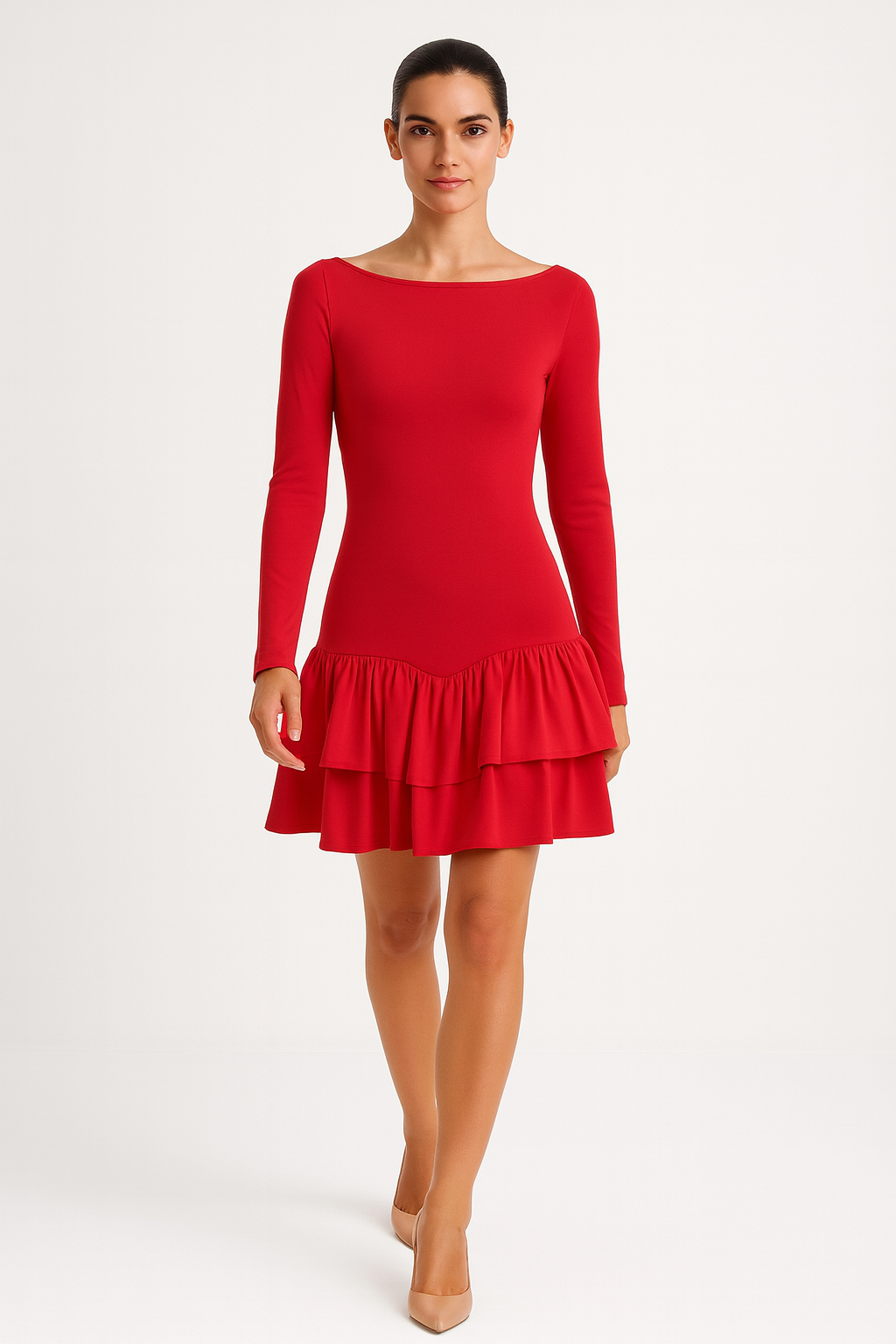 Kort kjole med lagdelt skørt | Lange ærmer | Elegant O-hals design