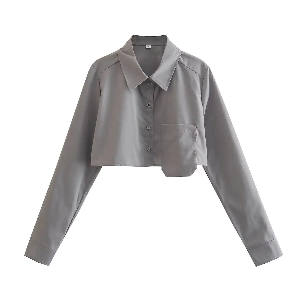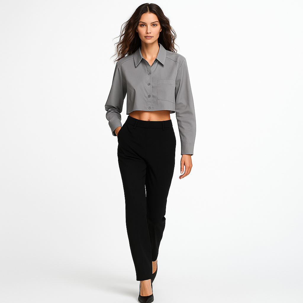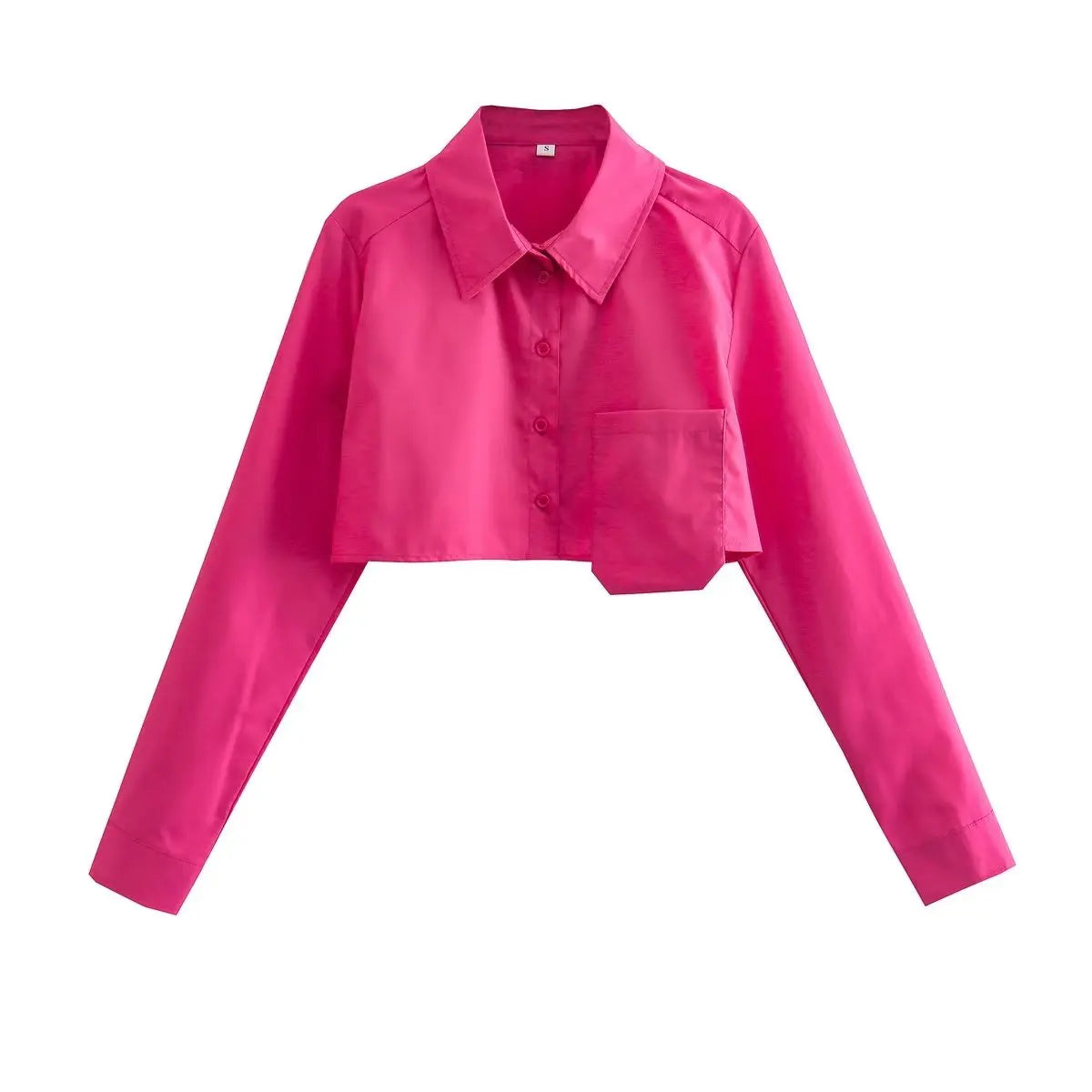 Denne cropped skjorte giver et elegant twist på klassisk kontormode. Med sin minimalistiske pasform, asymmetriske brystlomme og levende farver som pink, blå, grå og armygrøn – er den perfekt til både business og casual styling.