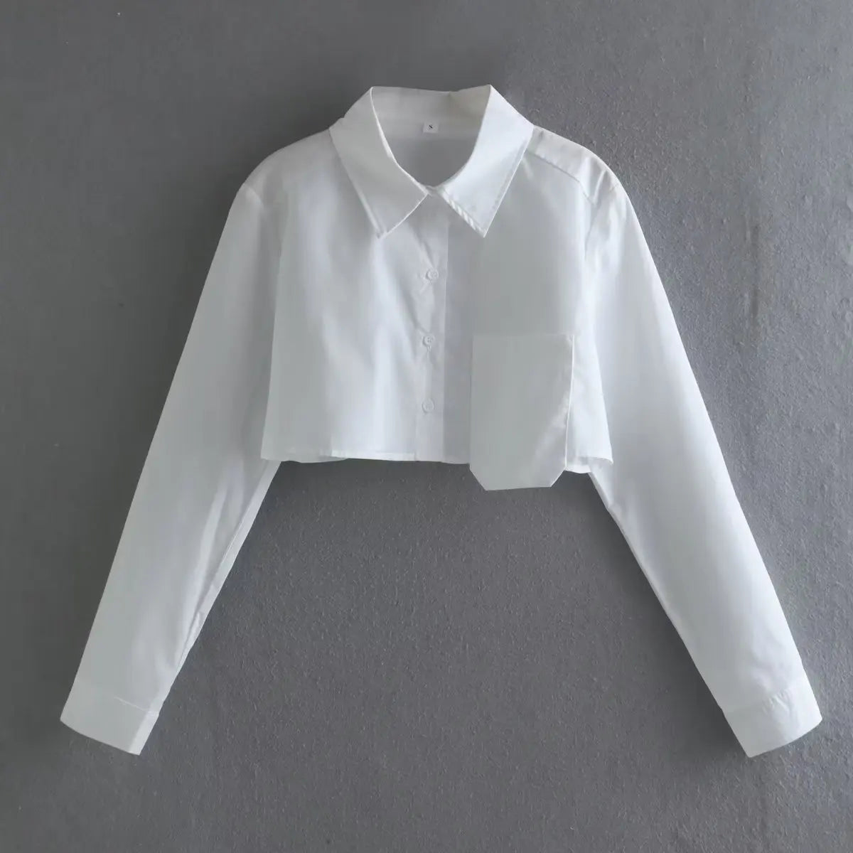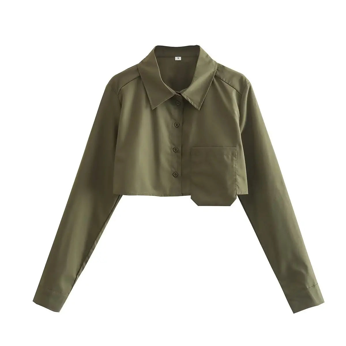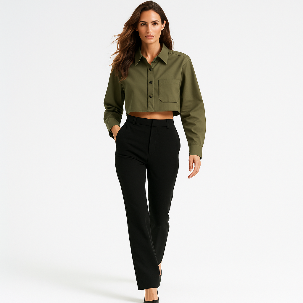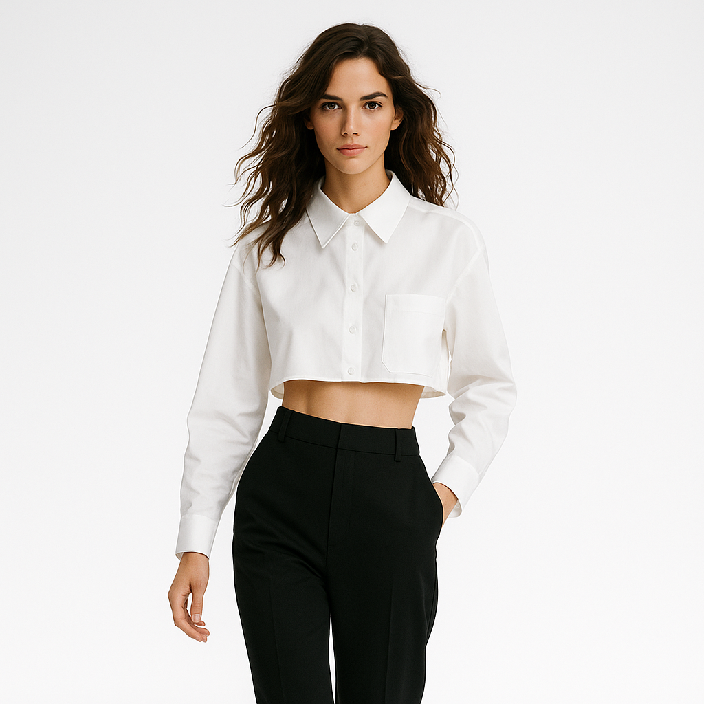Denne cropped skjorte giver et elegant twist på klassisk kontormode. Med sin minimalistiske pasform, asymmetriske brystlomme og levende farver som pink, blå, grå og armygrøn – er den perfekt til både business og casual styling.