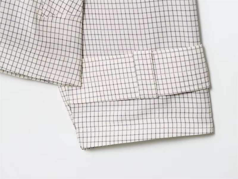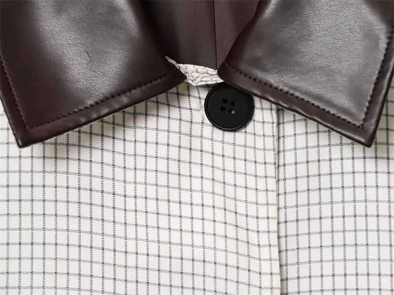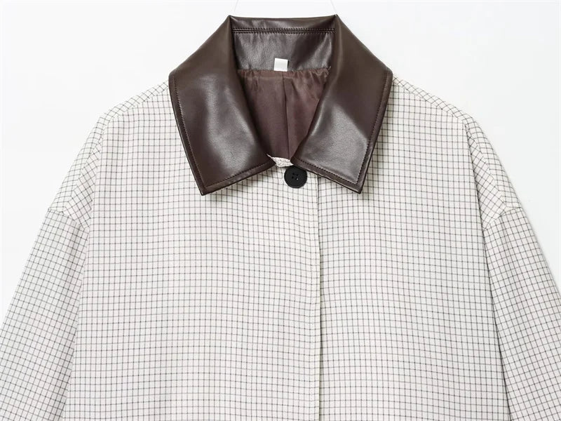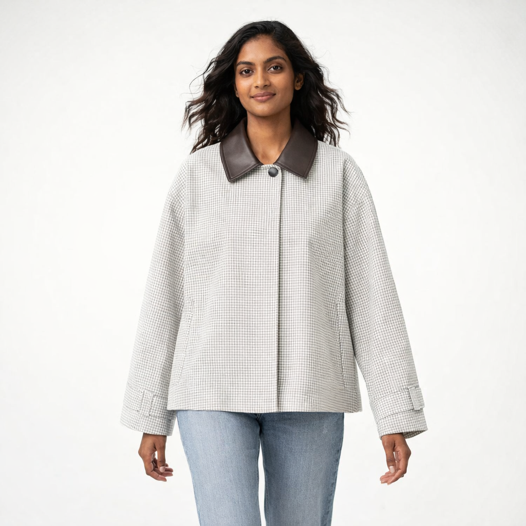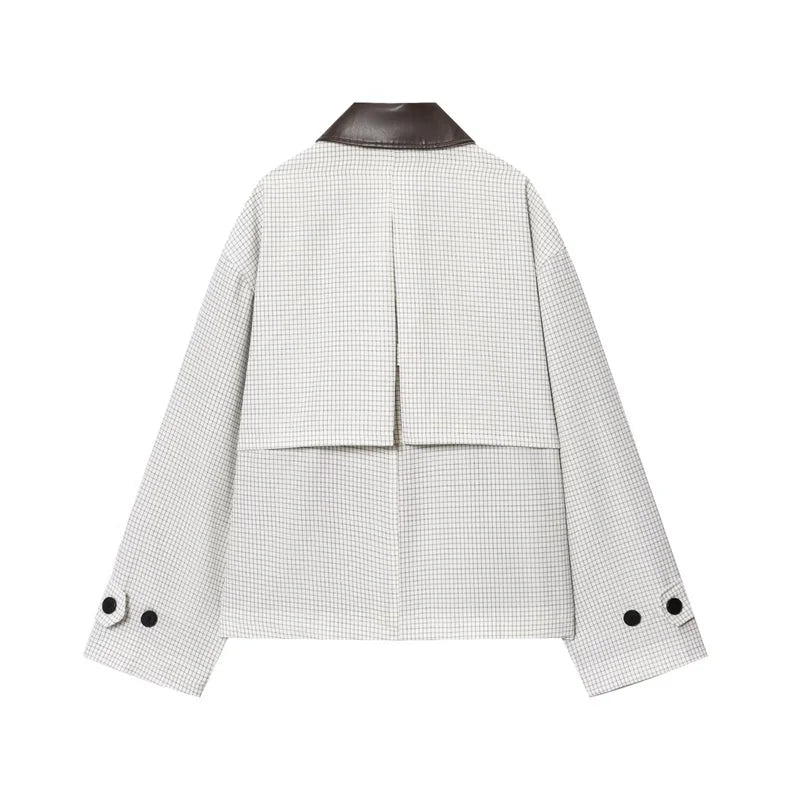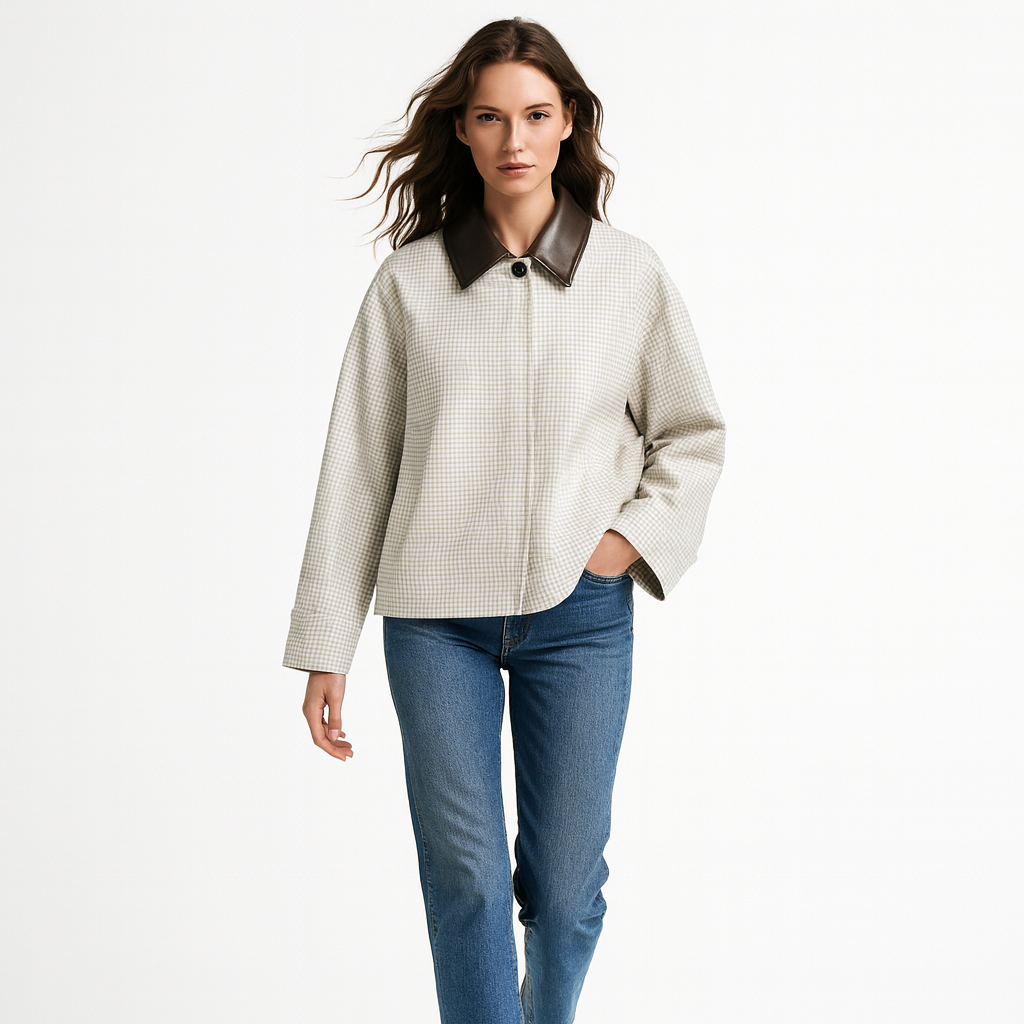 Skab et stilfuldt og moderne udtryk med denne korte jakke i et diskret ternet mønster. Den dekorative krave i højkvalitets imiteret læder tilfører et eksklusivt twist, som gør jakken perfekt til både hverdagsbrug og mere elegante outfits. En let og alsidig jakke, der fremhæver et sofistikeret, tidløst look.