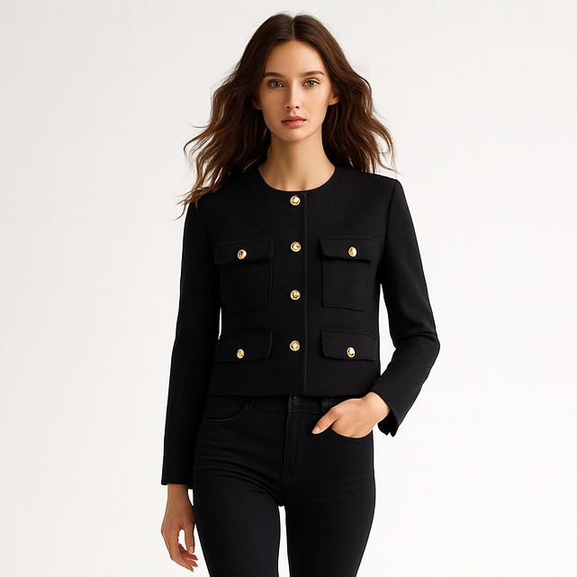 Tilføj et elegant og tidløst element til garderoben med denne kortere tweedjakke, der kombinerer et sofistikeret snit med et moderne, struktureret udtryk. Den rene silhuet og dekorative knapper gør den ideel til både arbejde, middage og stilsikre hverdagslooks. En alsidig jakke, der løfter ethvert outfit med et poleret touch.