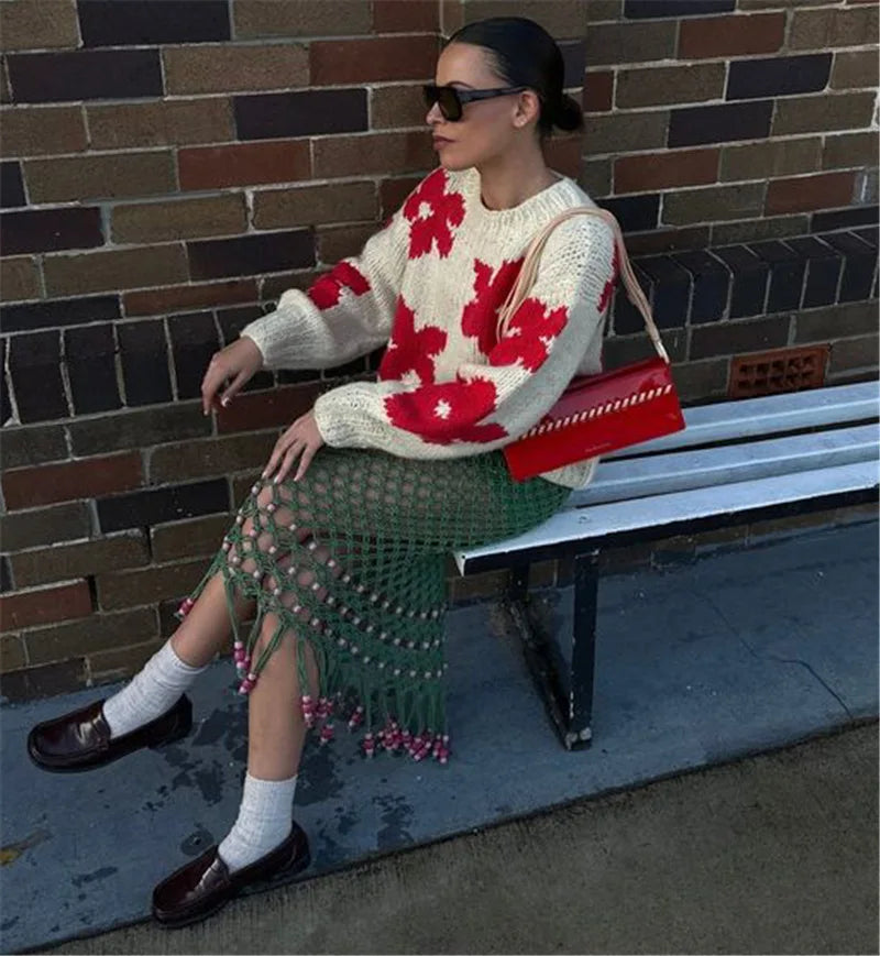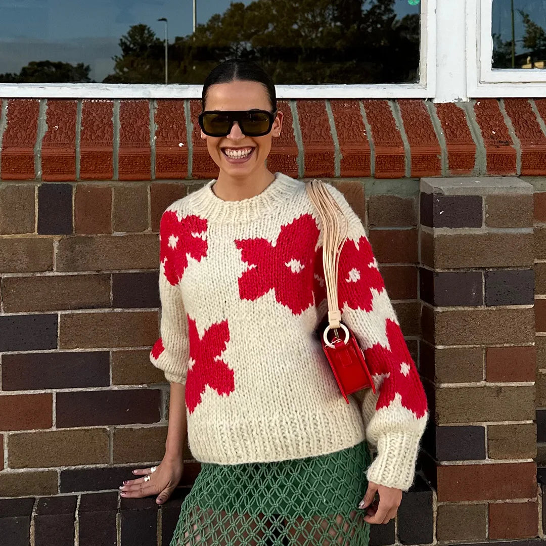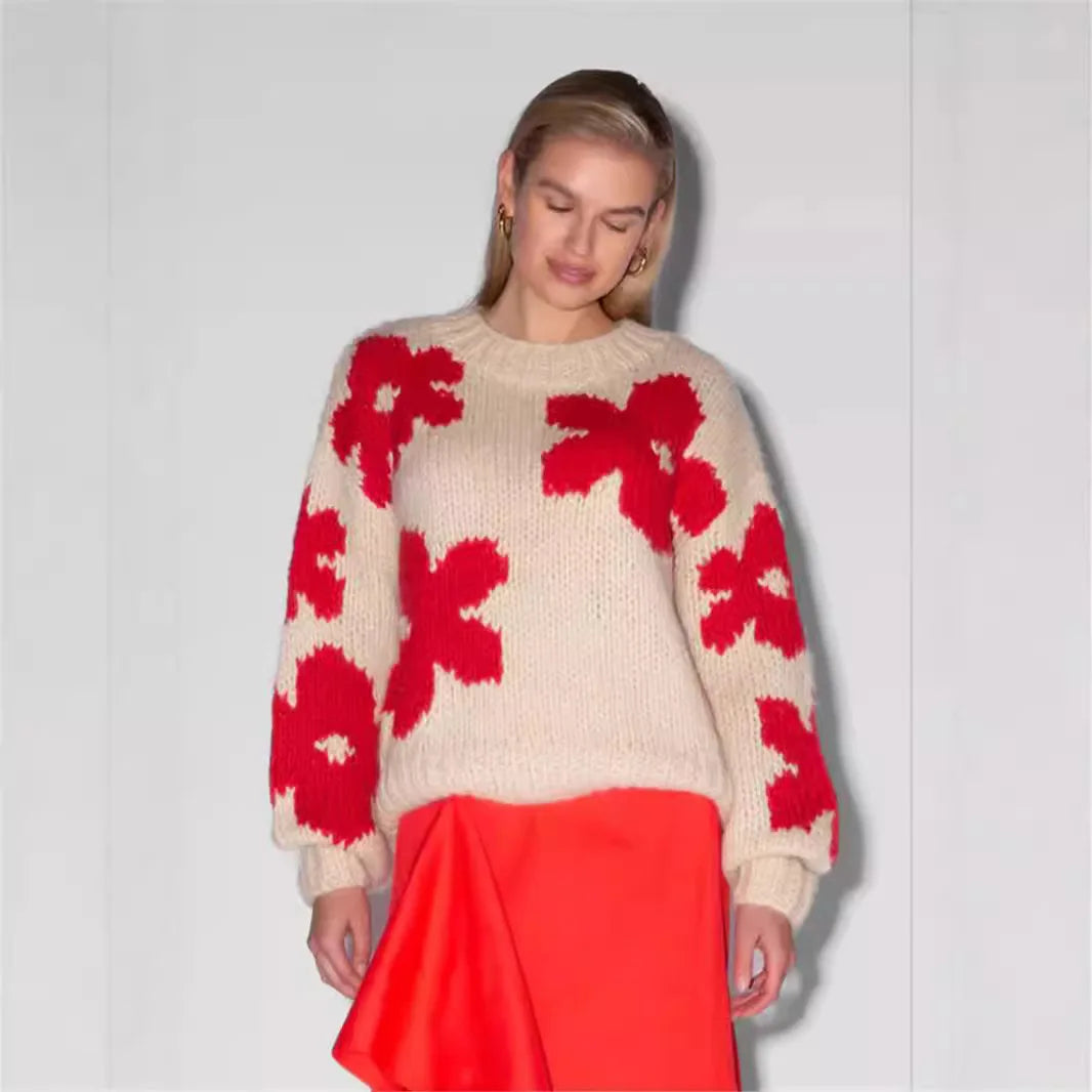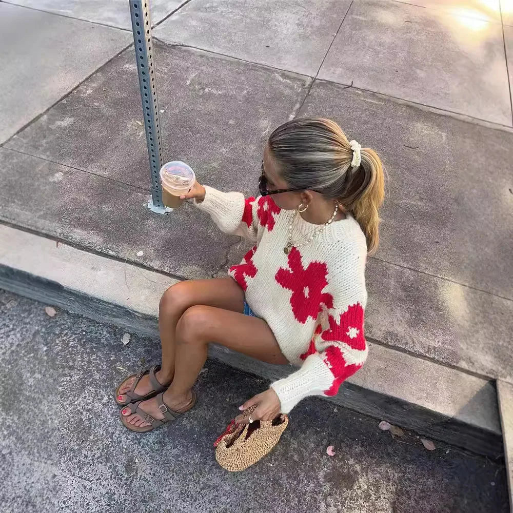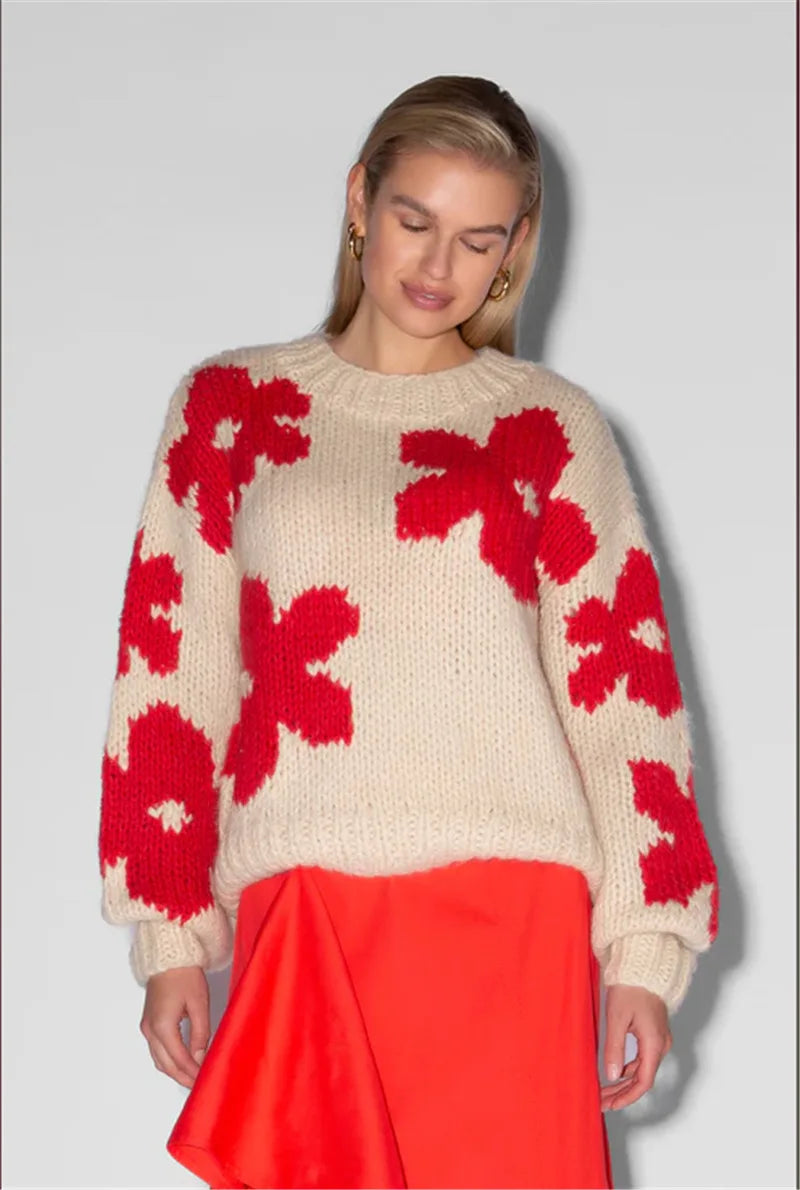 Tilføj et legende og feminint touch til din garderobe med denne bløde striktrøje med blomsterdetaljer. Den afslappede pasform og chunky strik gør den både varm og stilfuld – perfekt til kølige dage og hyggelige stunder.