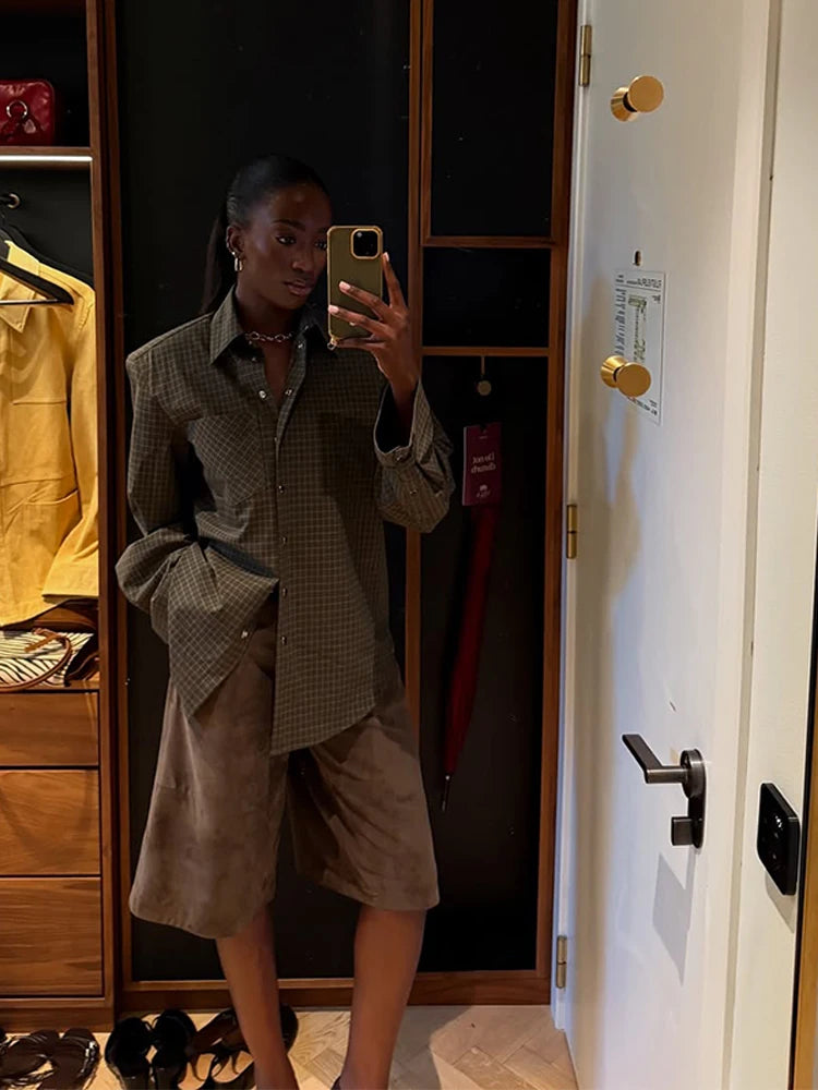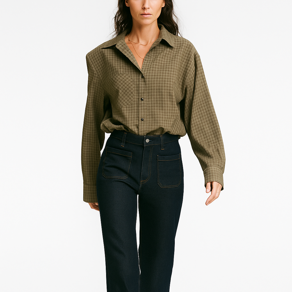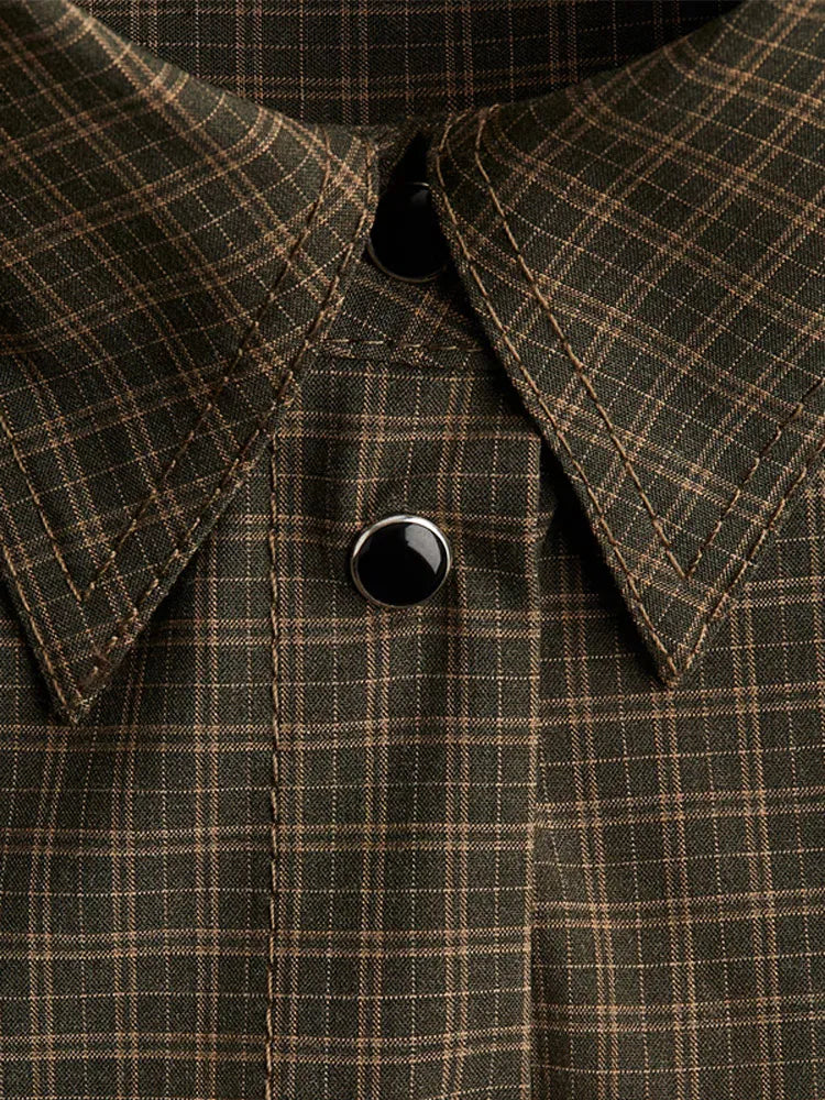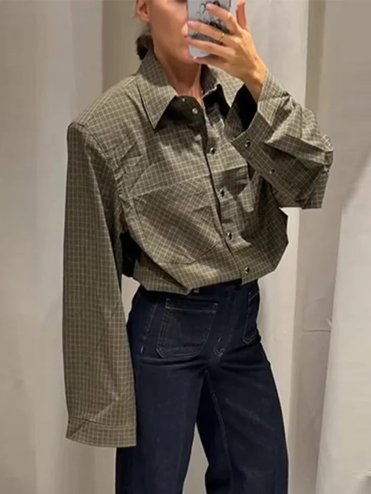 Tilføj et vintage-inspireret touch til din garderobe med denne klassiske ternede skjorte. Den løse pasform, tidløse krave og lette skulderpuder giver et sofistikeret, men ubesværet udtryk, perfekt til både kontor og afslappede dage.