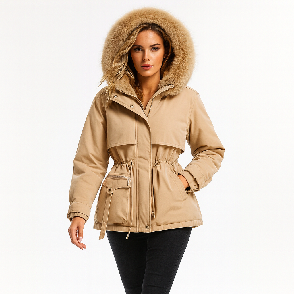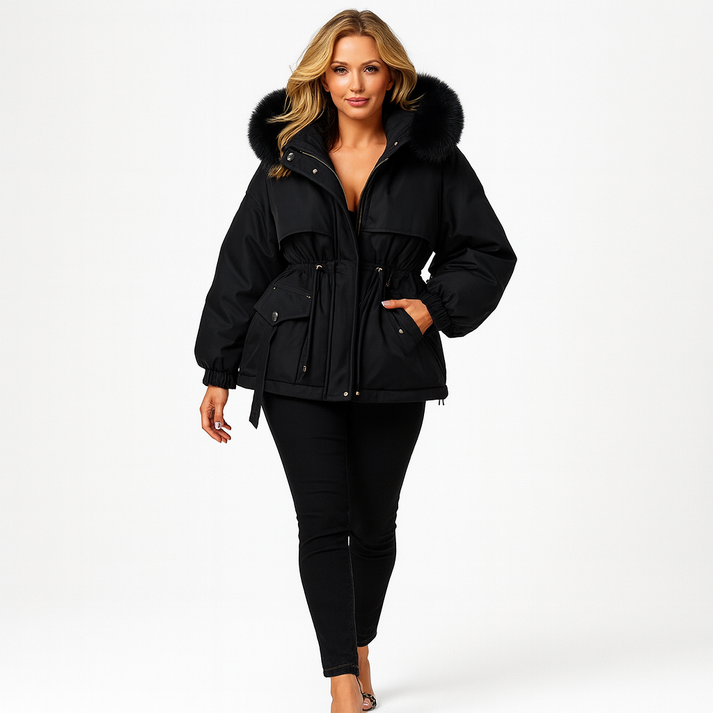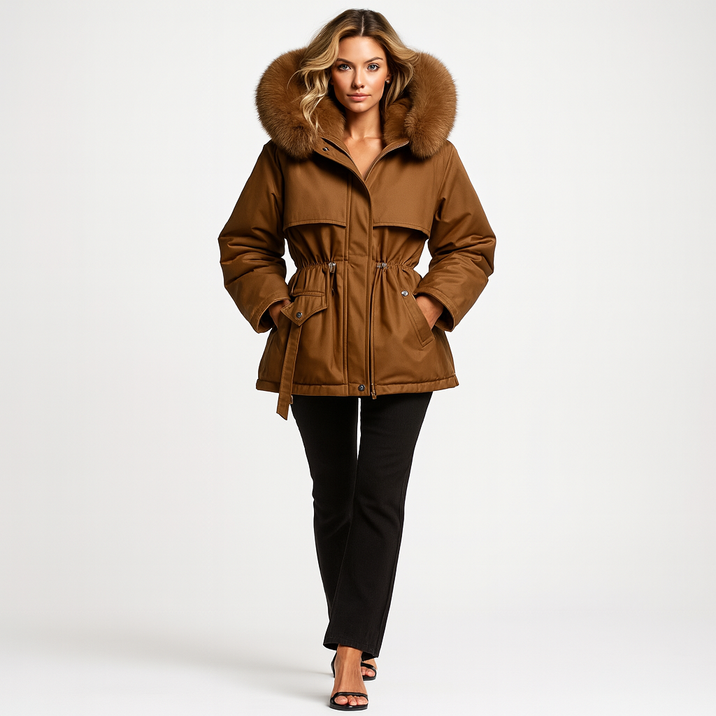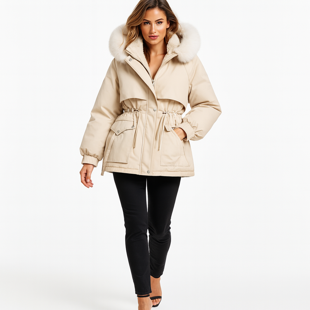 Hold dig varm med stil denne vinter. Denne afslappede, foret jakke kombinerer funktion og mode med sit bløde materiale, justerbare taljebånd og aftagelige hætte – perfekt til kolde dage, hvor komfort og elegance går hånd i hånd.