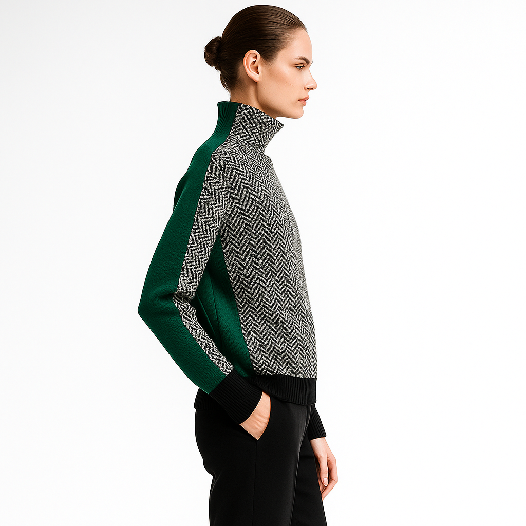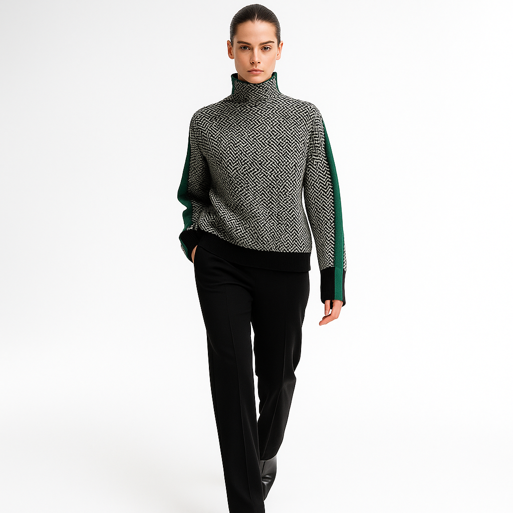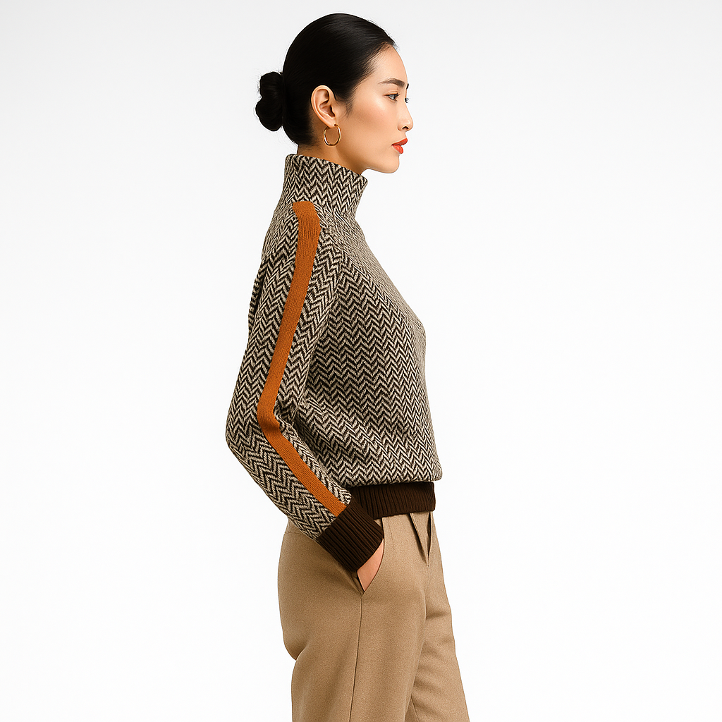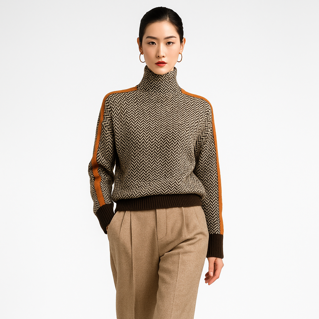Oplev en perfekt balance mellem stil og komfort med denne elegante rullekravesweater i moderne chevronmønster. Designet til den stilbevidste kvinde, der ønsker et tidløst look, der både føles og ser eksklusivt ud – ideel til hverdagsbrug, kontoret eller hyggelige vinteraftener.