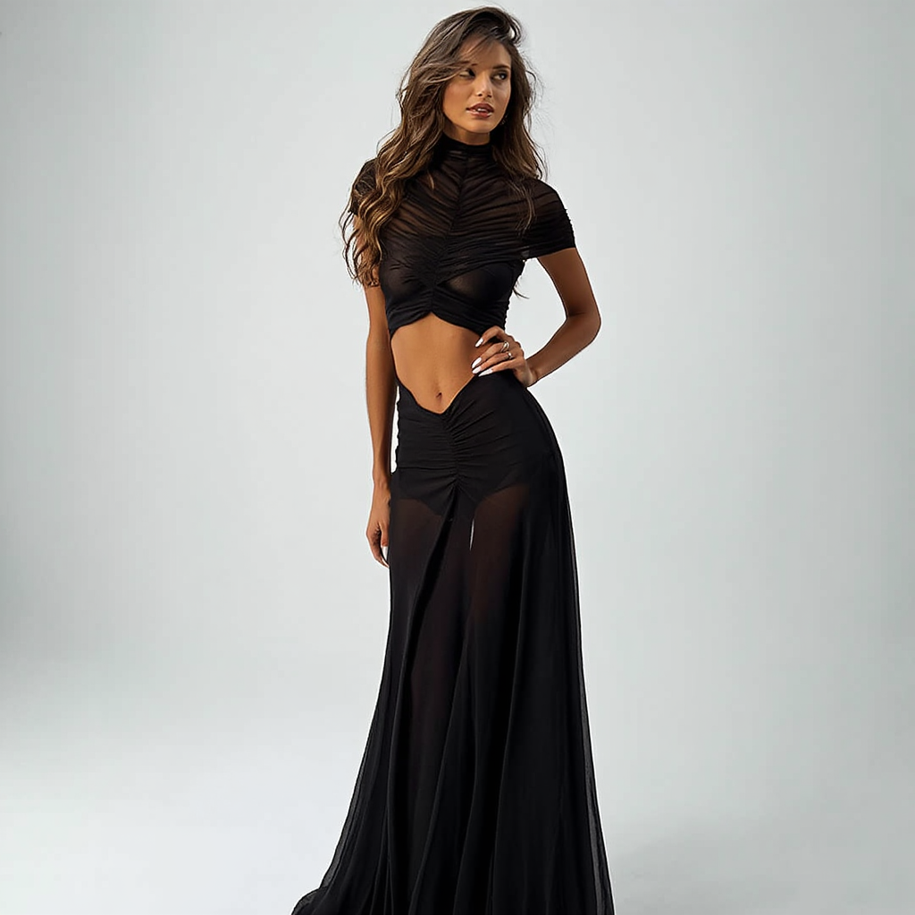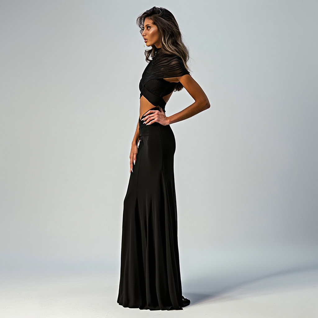Lang aftenkjole til kvinder | Meshdetaljer og udskæringer | Figursyet maxi med høj hals