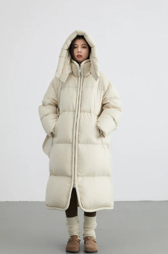 Denne lange dunjakke kombinerer et moderne, komfortabelt design med et elegant og voluminøst udtryk, som giver en varm og omsluttende følelse. Den lette konstruktion og de brede kanaler skaber et harmonisk look, mens den afslappede silhuet giver plads til bevægelse og gør jakken ideel til både hverdagsbrug og længere ture. En funktionel og stilfuld overdel, der tilføjer garderoben et luksuriøst, blødt touch.